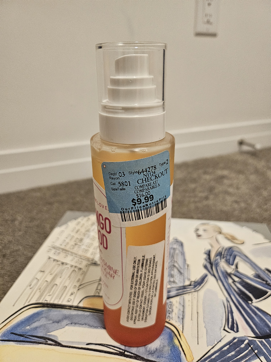 Lightly used bottle of Nature Love Mango Mood Hair & Body Mist. Mango, Jasmine, Brown Sugar & Vanilla scent. 6 fl oz / 177 ml. Great for hair and body.