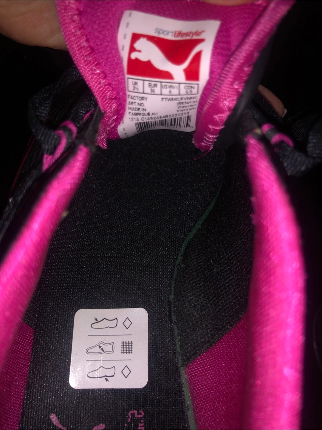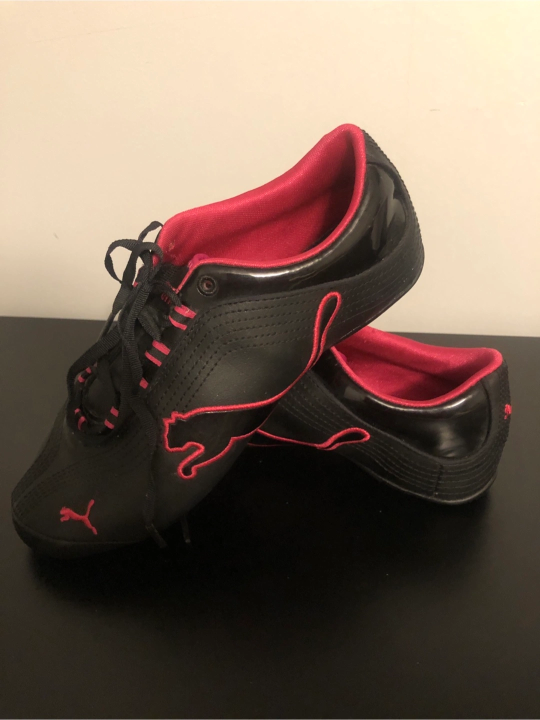 Black leather Puma sneakers with pink accents. Lace-up closure. EcoOrthoLite insole. Great condition.
