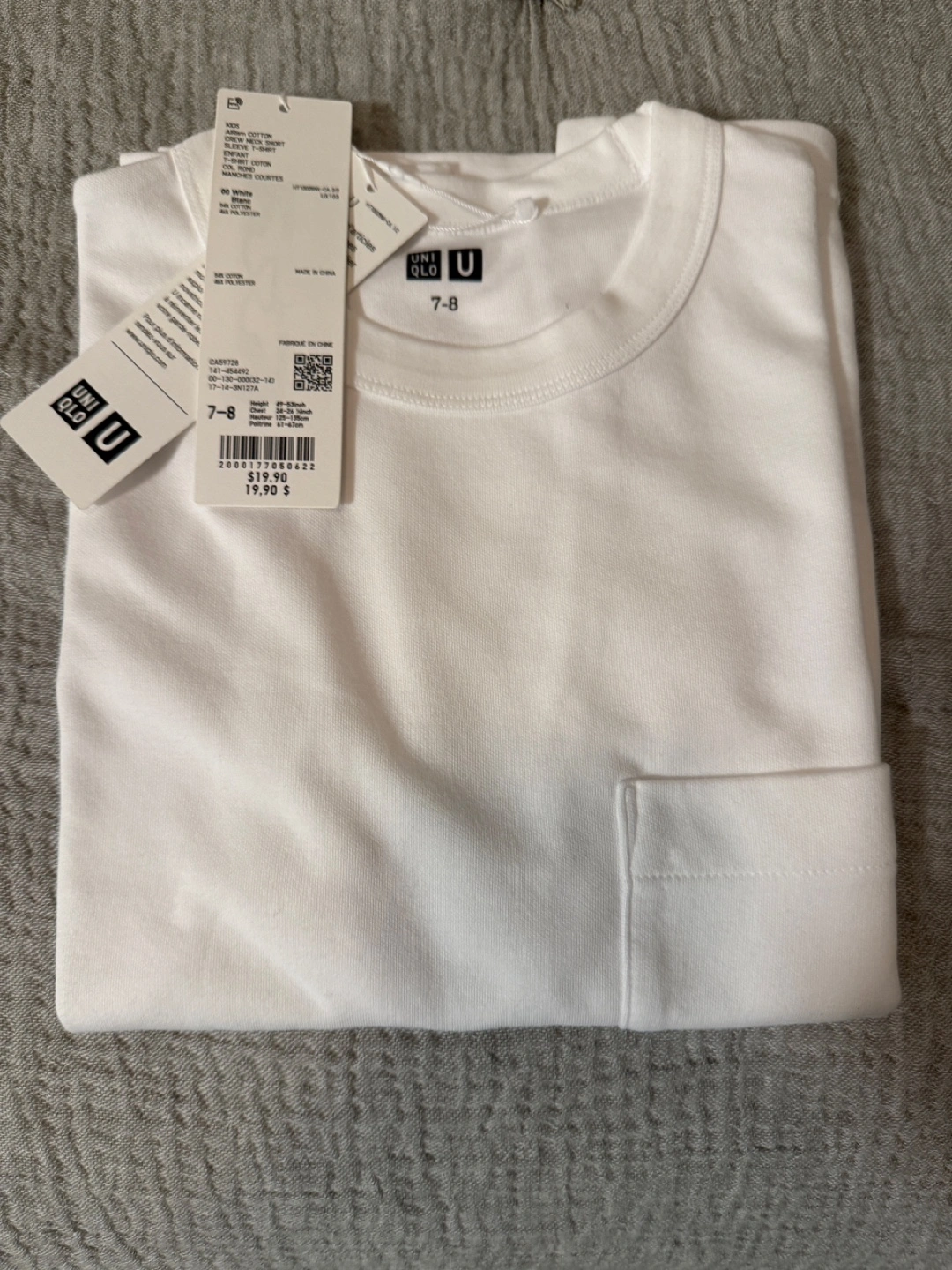 Brand new white cotton t-shirt. Size 7-8. Features a small pocket. Short sleeves. Great for everyday wear.
