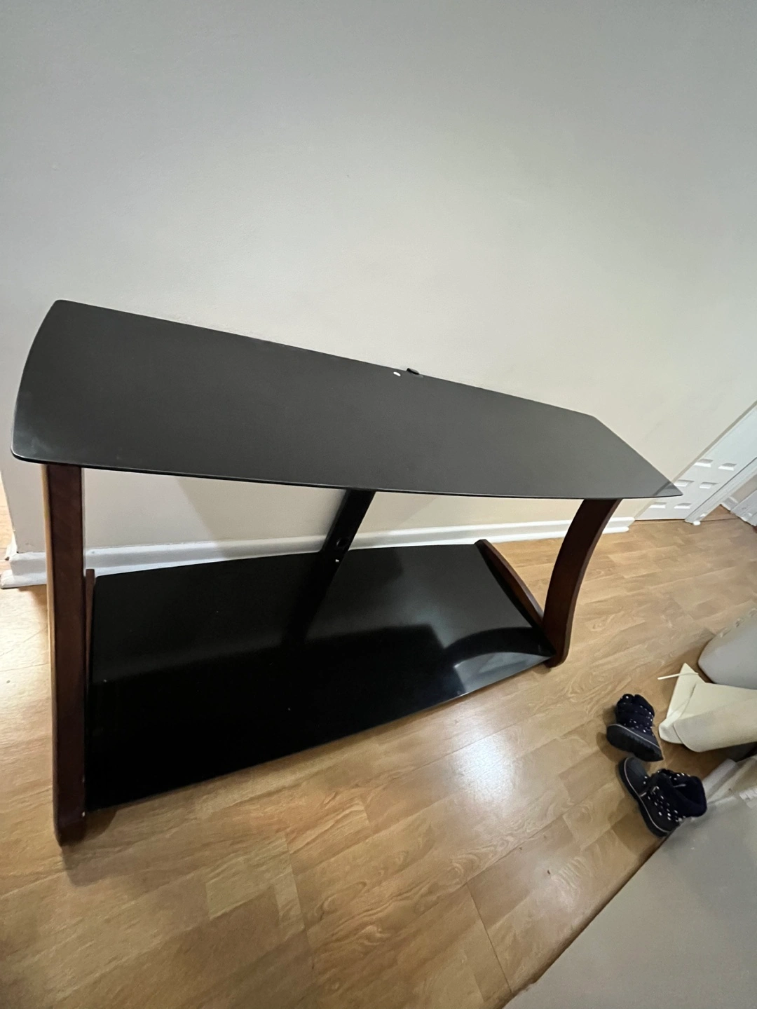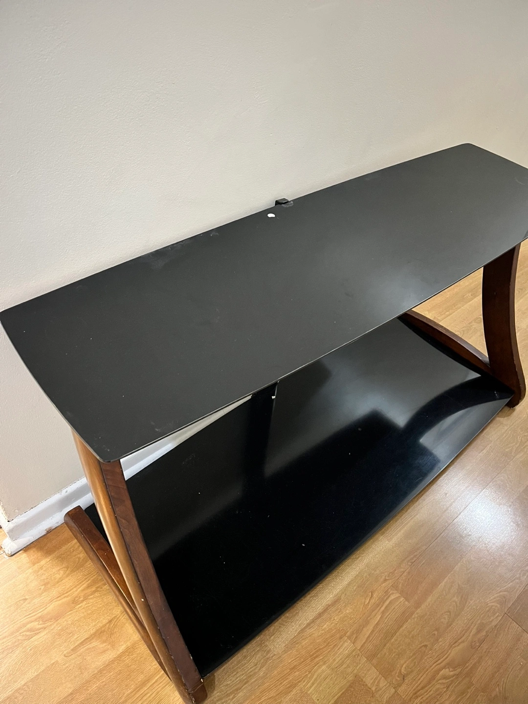 Sleek black glass TV stand. Two shelves. Curved wood legs. Great for smaller TVs. It can hold up to 50inch TV