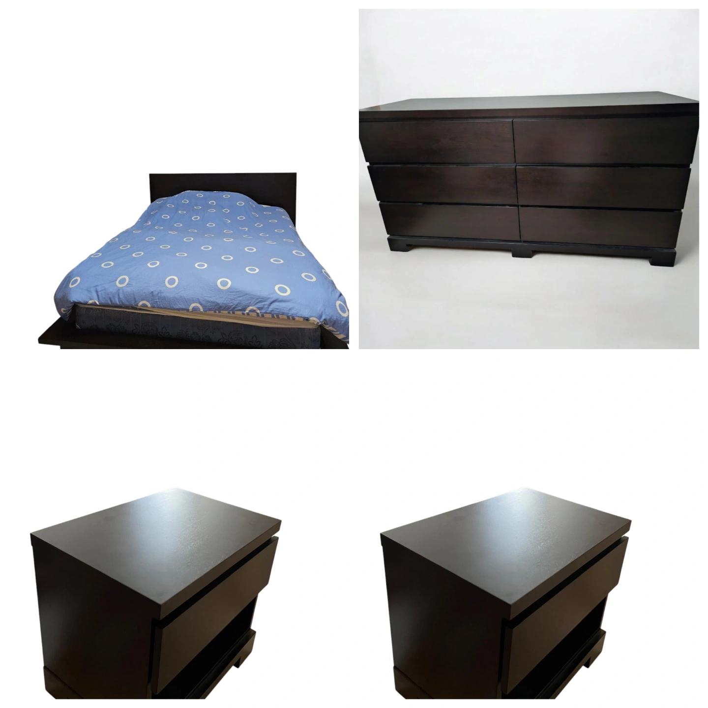 Modern bedroom set. Includes queen-size bed frame, six-drawer dresser, and two nightstands. Dark brown finish. Minimalist design.