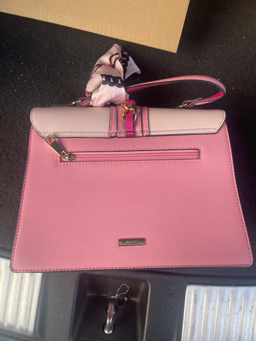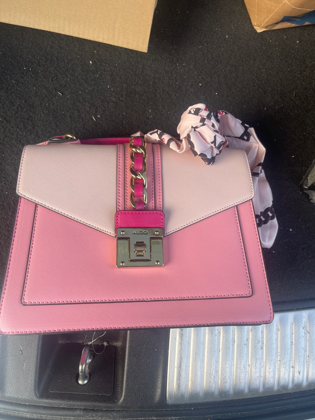 Elevate your style with this chic, used Aldo handbag featuring a delightful pink colour block design and elegant gold hardware. This sophisticated accessory is perfect for adding a pop of colour to any outfit. It has a small mark on the back, and comes with a decorative scarf.
