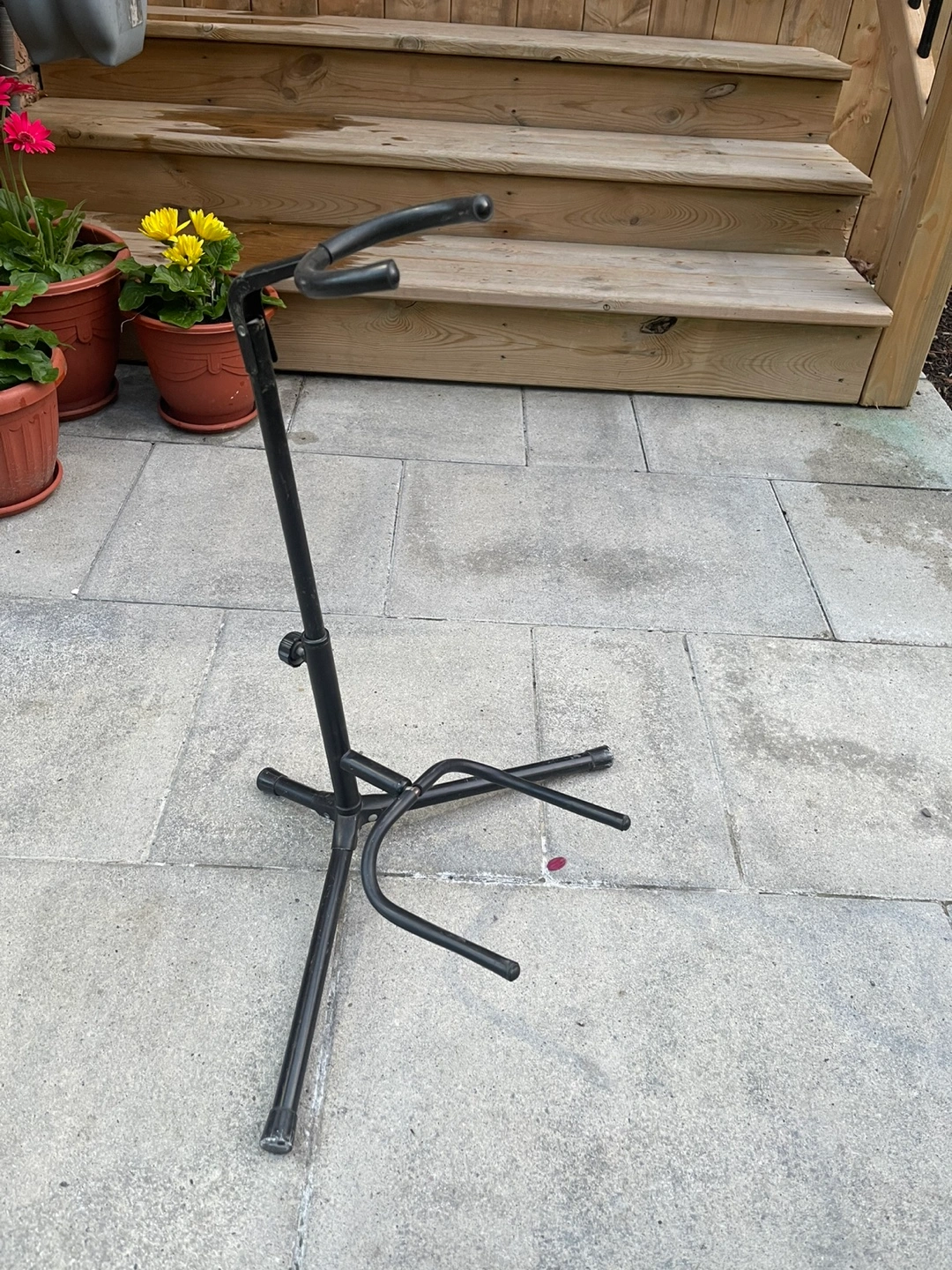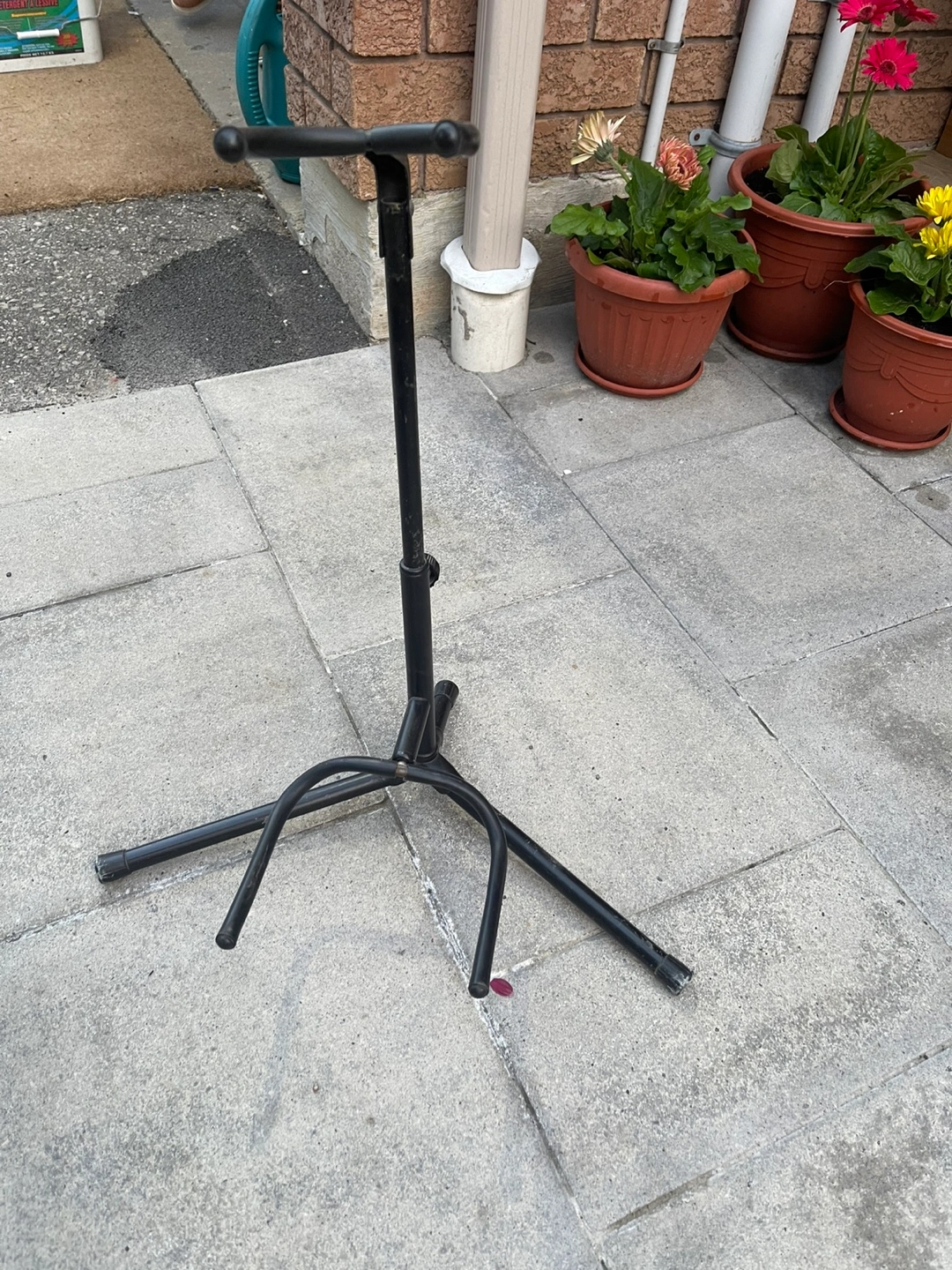 Black metal guitar stand. Three-legged base. Adjustable height. Suitable for acoustic or electric guitars.