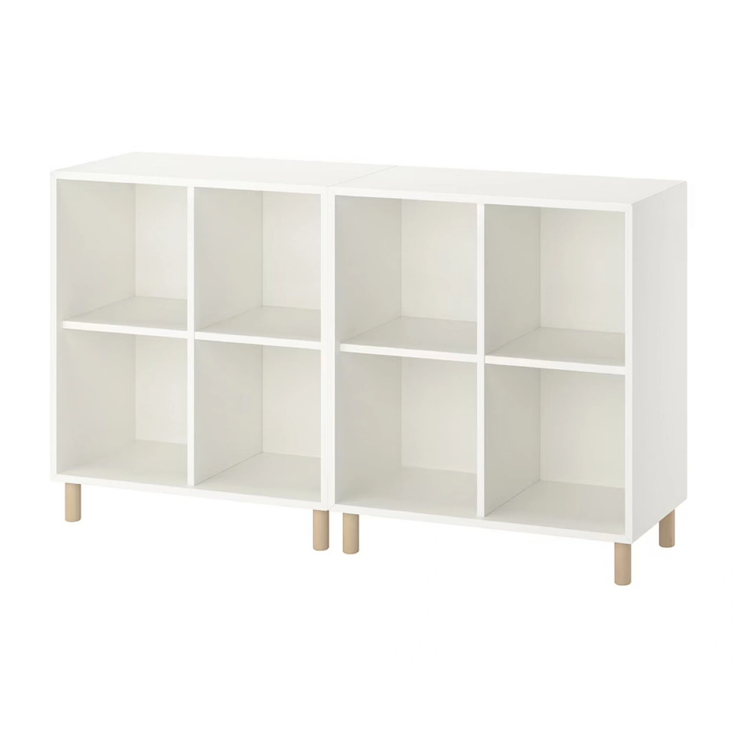 IKEA Eket wood legs remain in good condition. Previously installed on Eket units that have since been reconfigured to stack onto other Eket units.