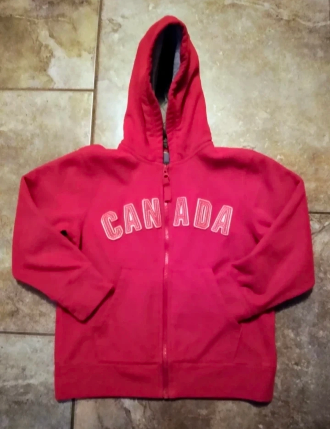 Red polar fleece warm hooded jacket with white "CANADA" letters on the front. Full zipper with pockets and quilted hood.