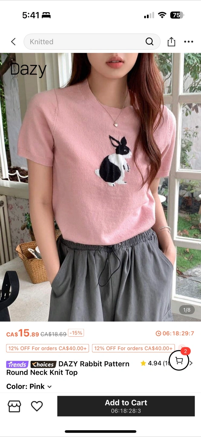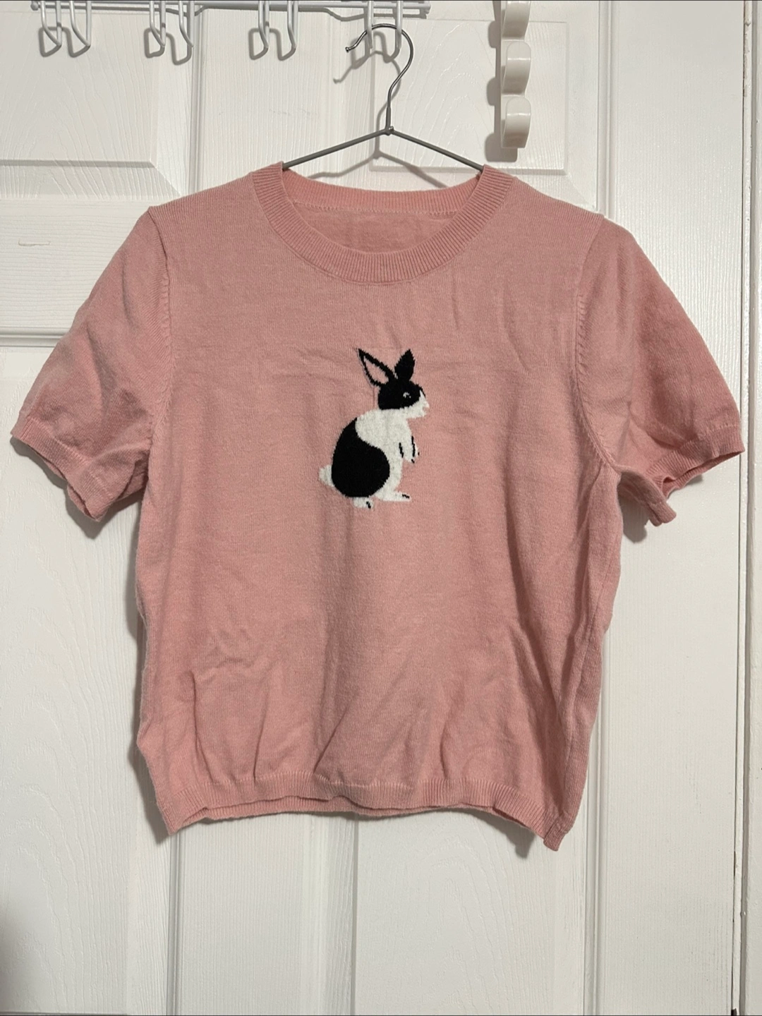 Adorable pink cropped top. Features a cute embroidered bunny. Short sleeves. Perfect for spring.