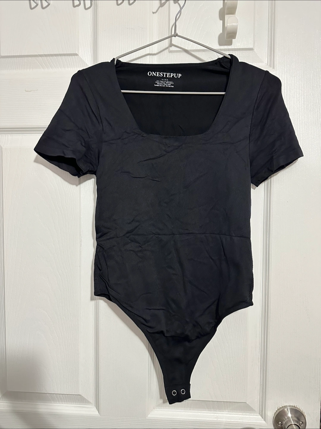 Black bodysuit. Short sleeves. Square neckline. Snap closure.