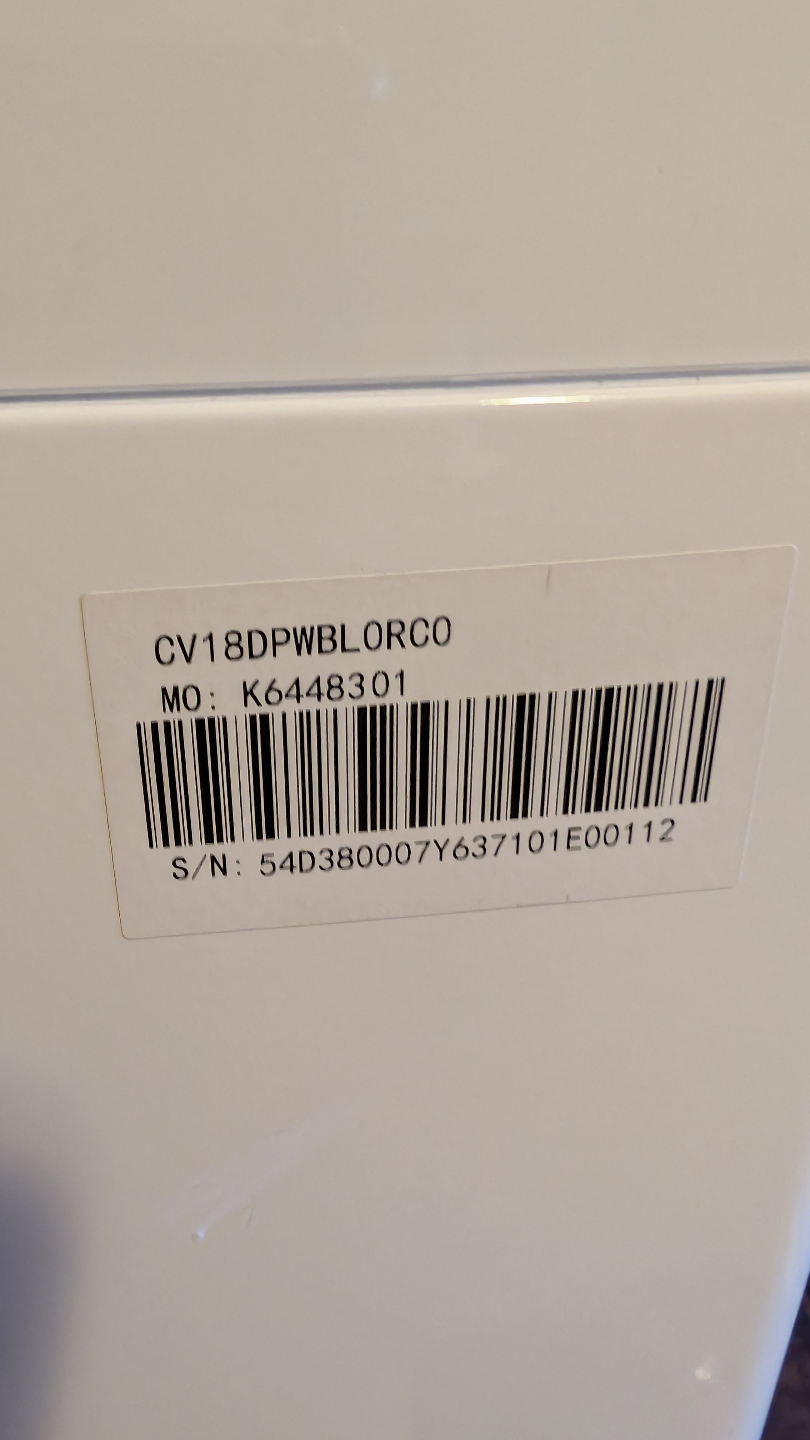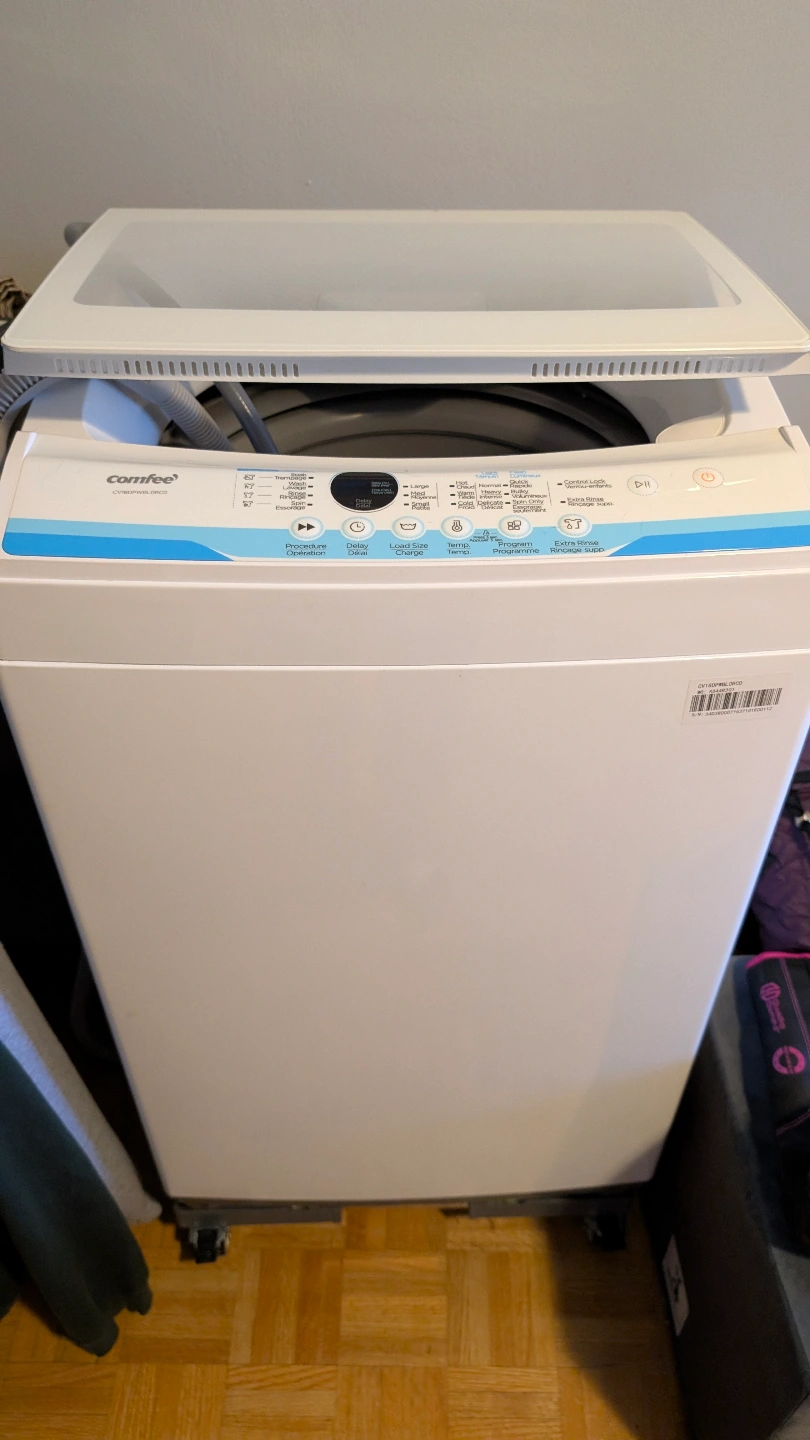 Clean Contempo top-load washing machine. Features various wash cycles and settings. Includes a delay start function. Model number CV18DPWBLORCO. Equipped with rolling casters for easy mobility. like new condition. purchased for my apartment but now I am moving and it's no longer needed.