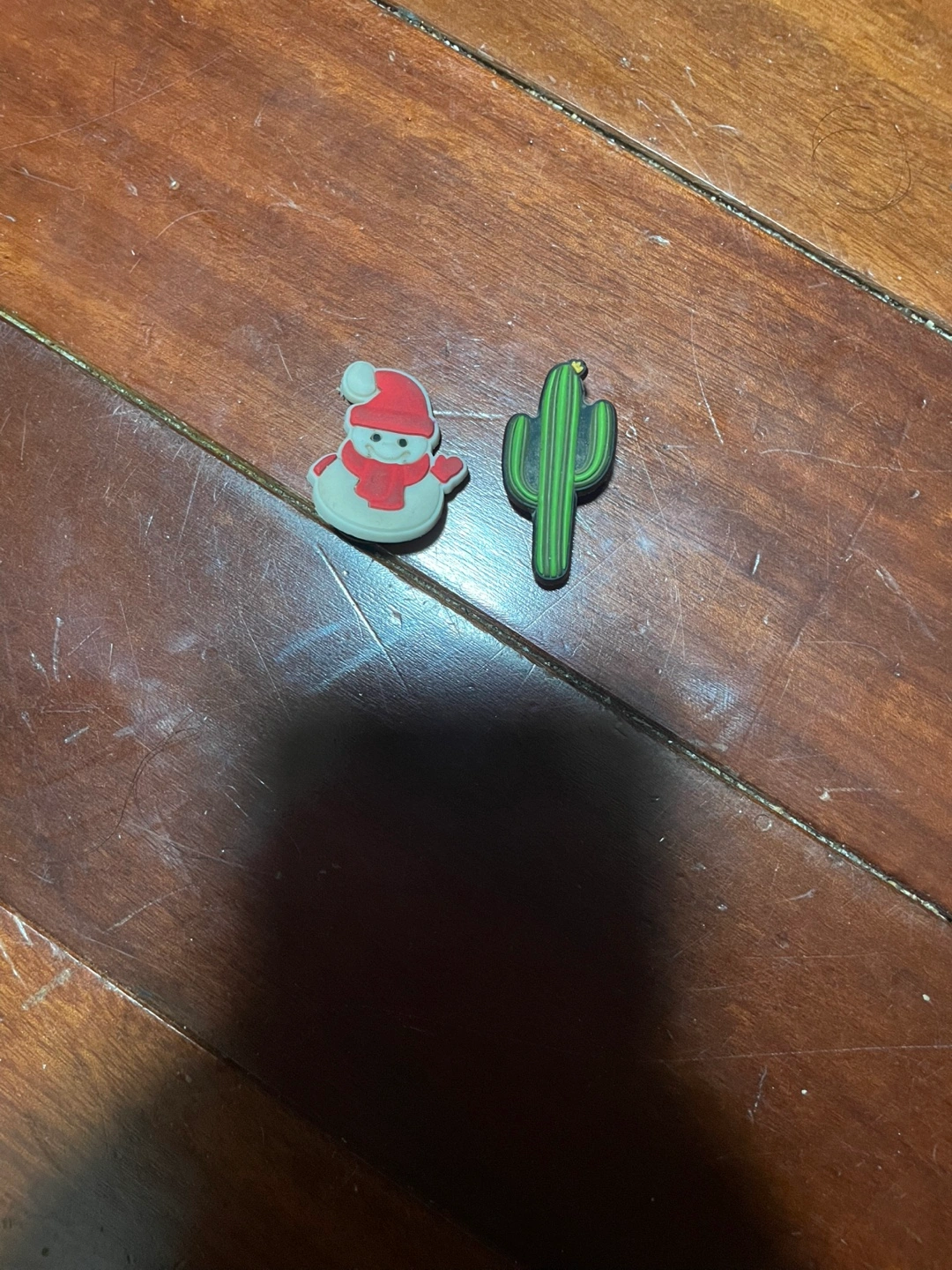 Two Jibbitz shoe charms. One snowman wearing a red hat and scarf. One green cactus. $3 each. $5 for both.