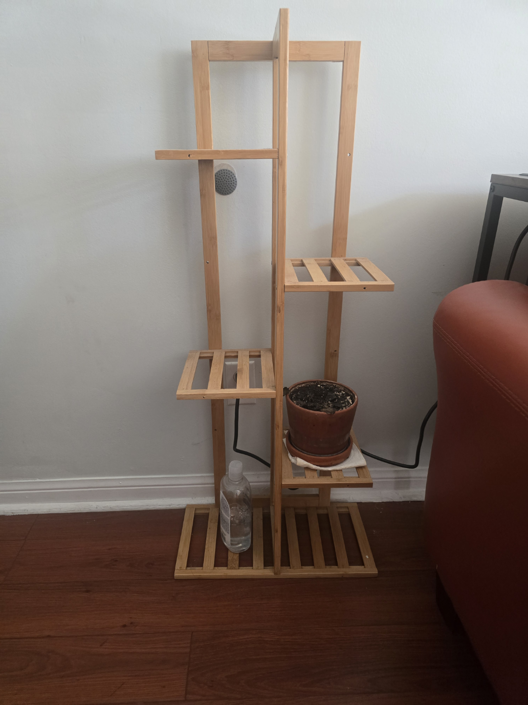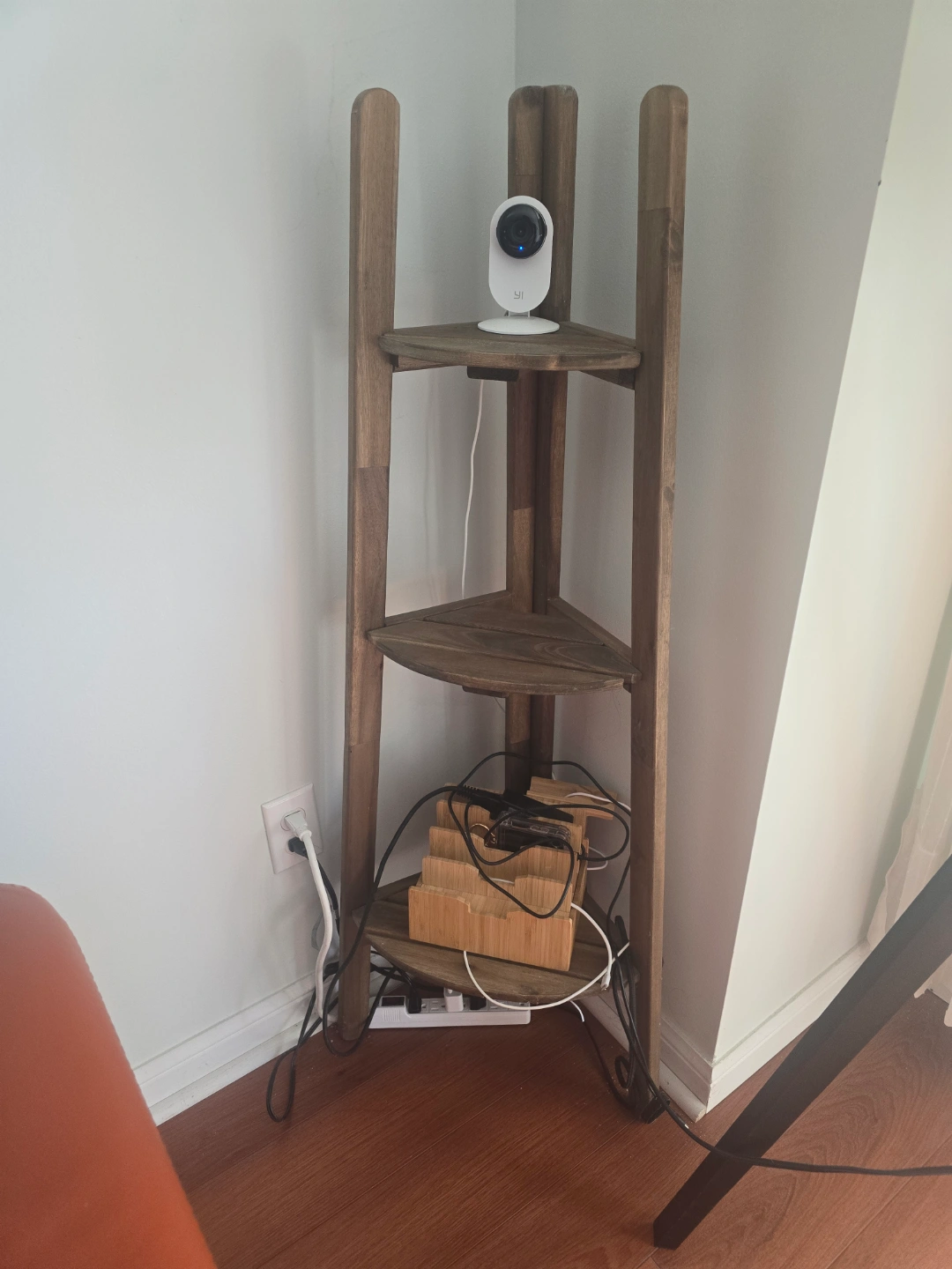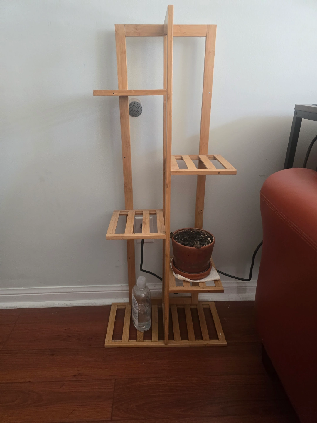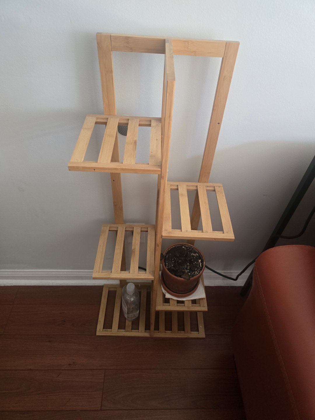 Two wooden shelves. One corner shelf, three tiers. One tall plant stand, six tiers. Both made of light brown wood. each sold for 20 or 30 for both