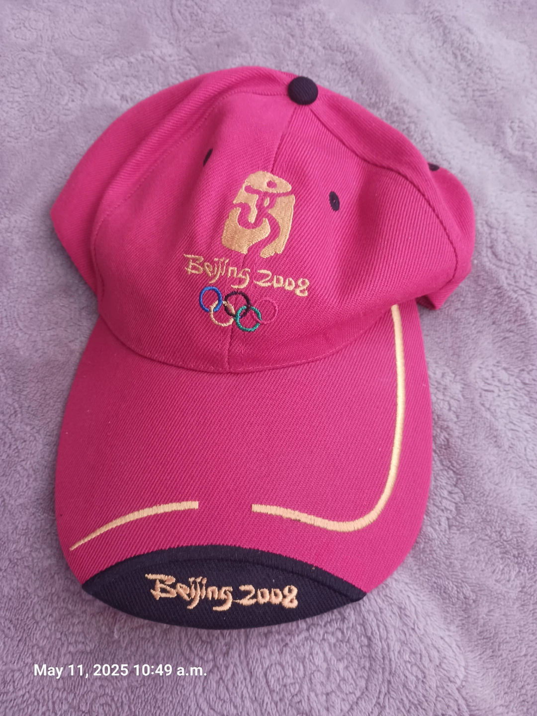 Red baseball cap. Features embroidered Beijing 2008 logo and Olympic rings. Gold accents. Black underside of bill. Collector's item.