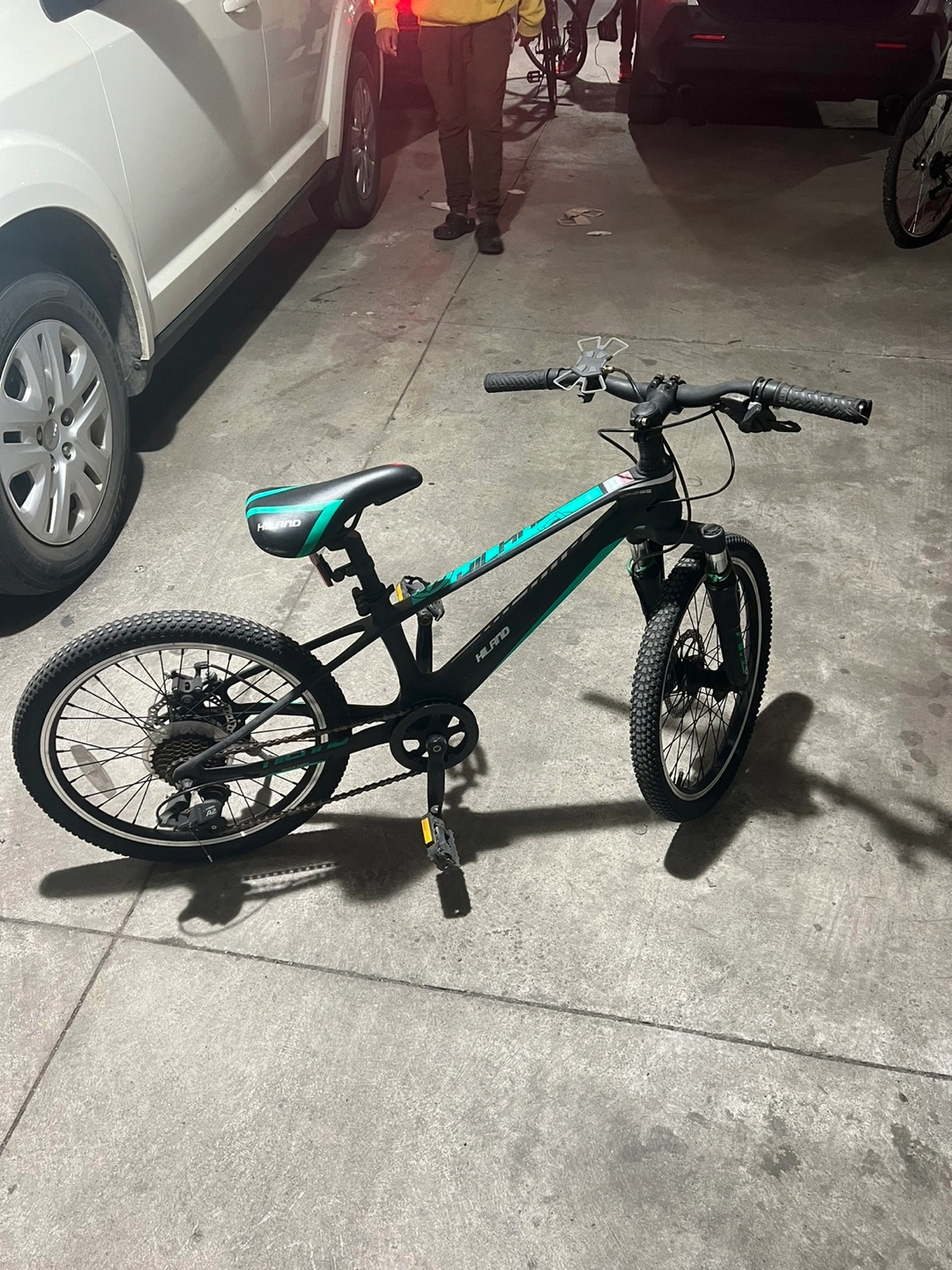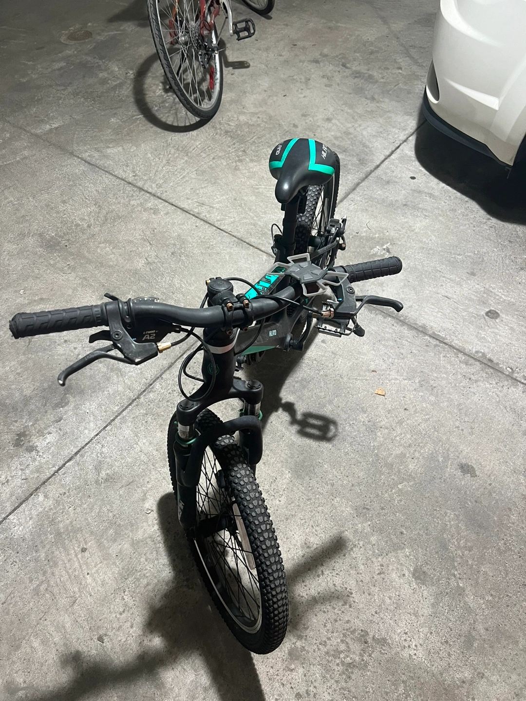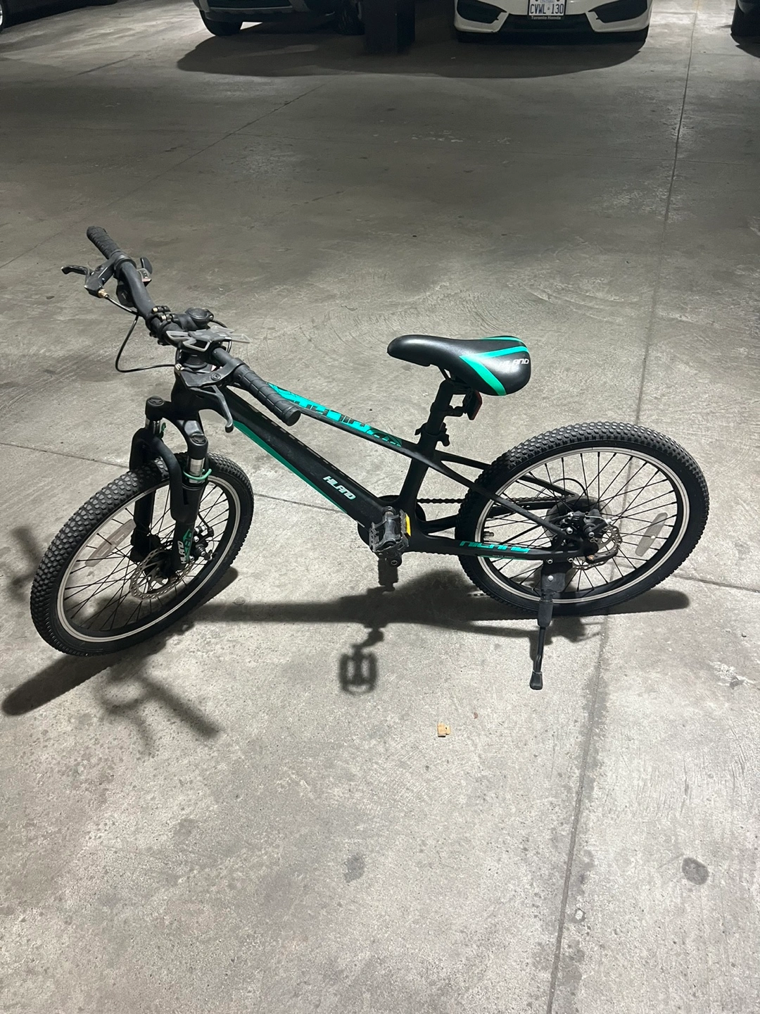 Black and teal kids' mountain bike. 20-inch wheels. Good condition. Front suspension forks. Suitable for younger riders.