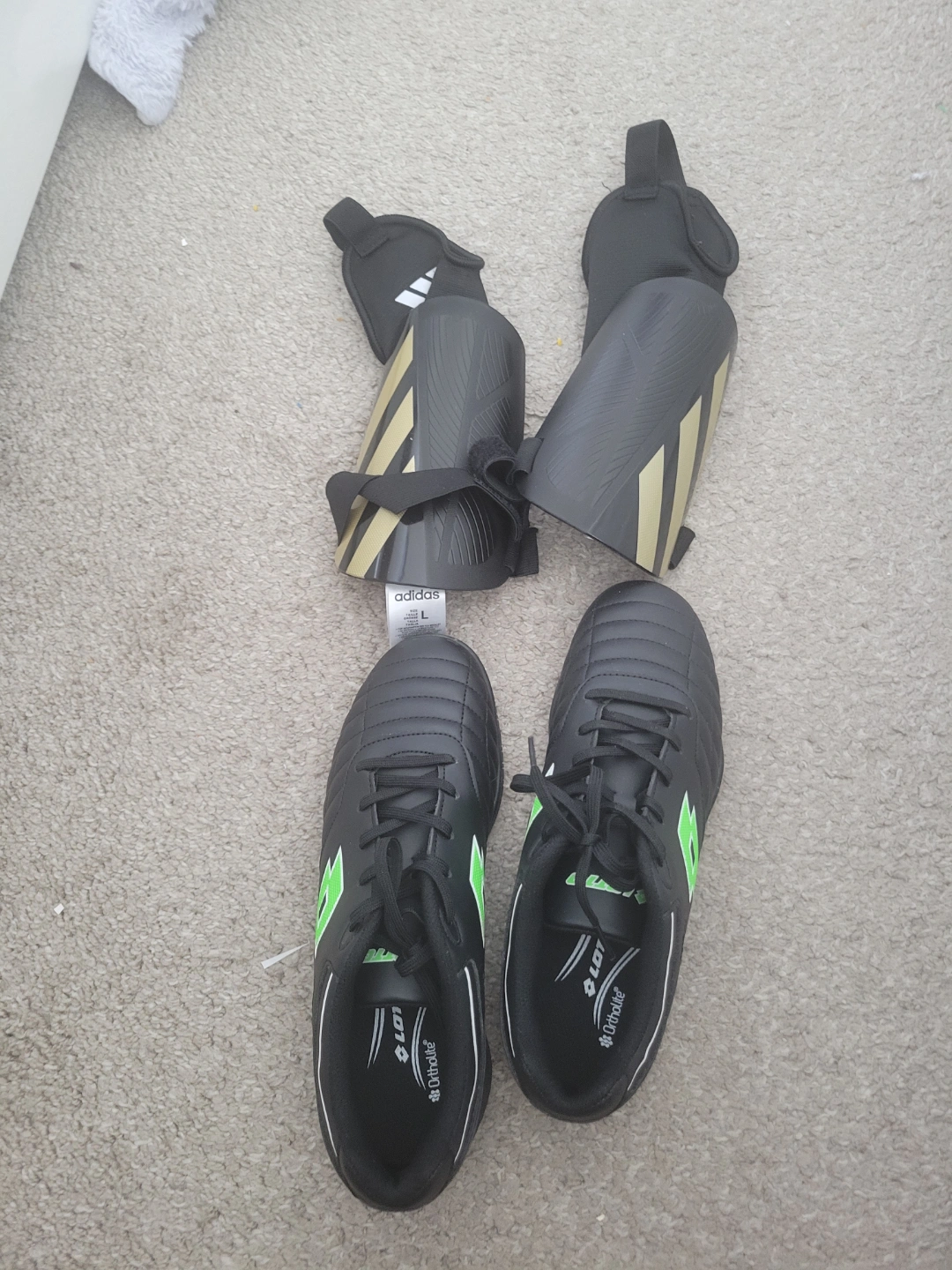 82Black Diadora soccer cleats, size not specified. Adidas shin guards, size large. Good condition. my son outgrown them and no longer need it(used only once)