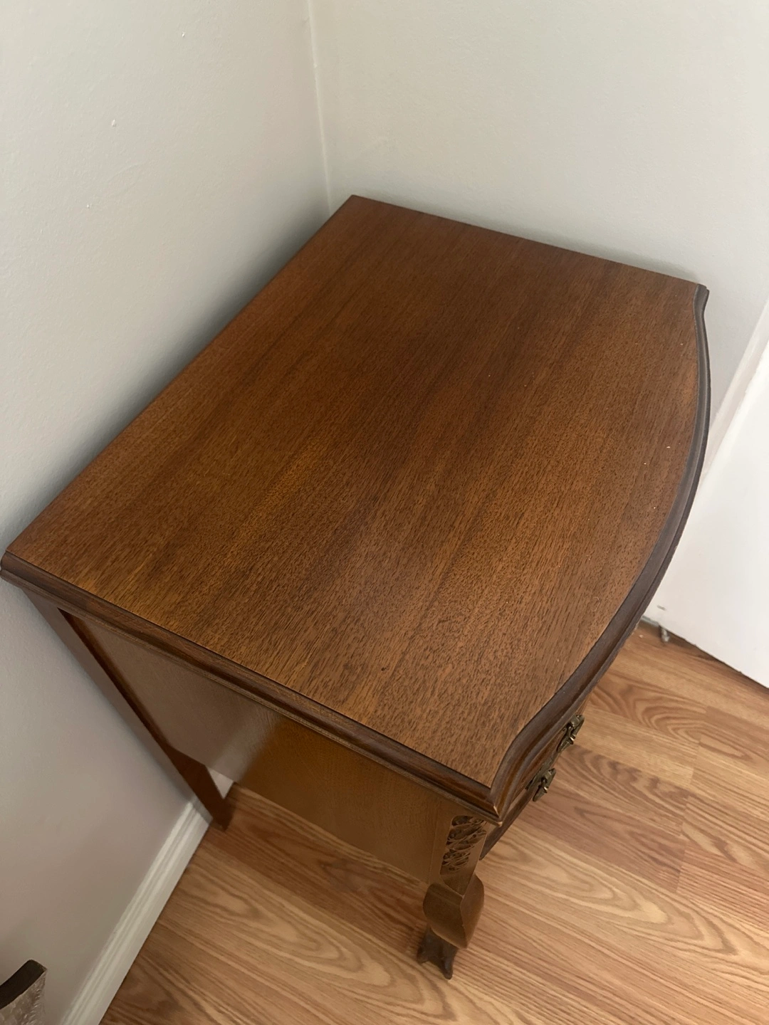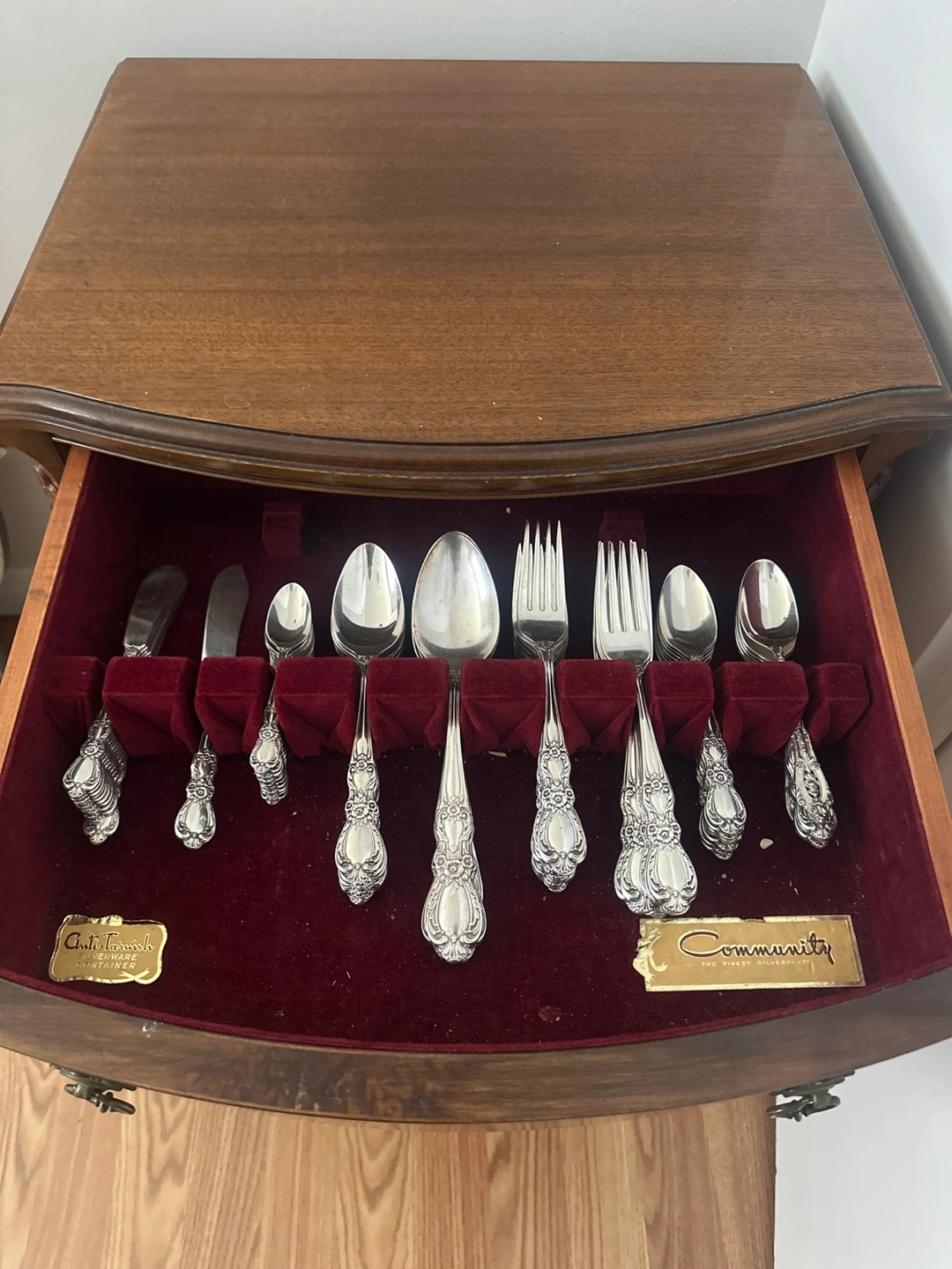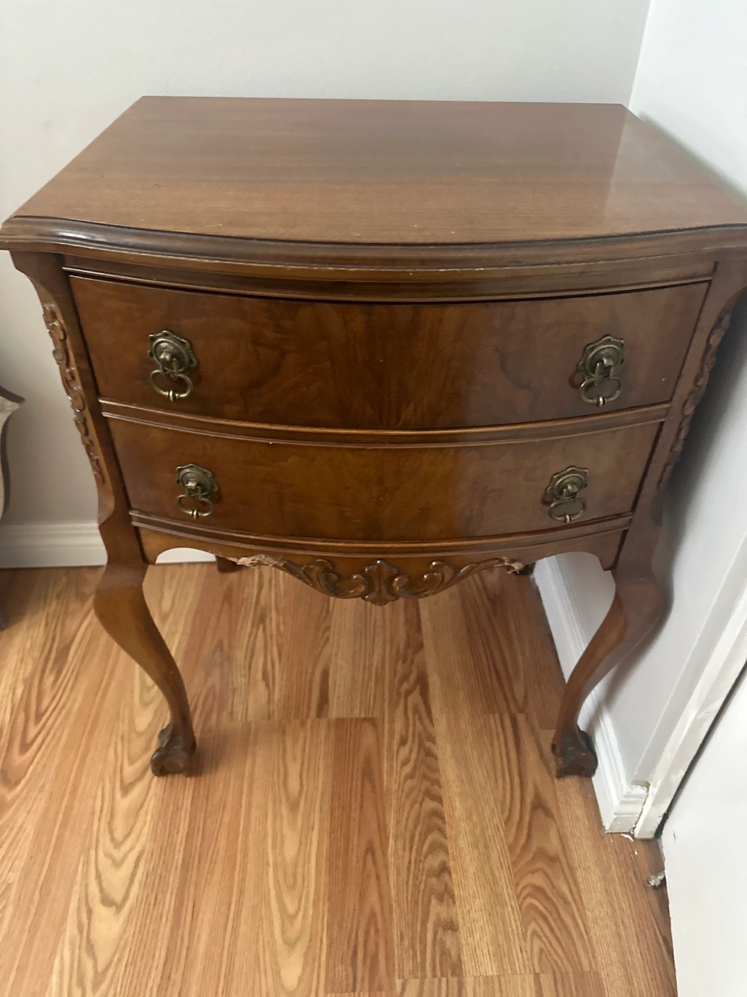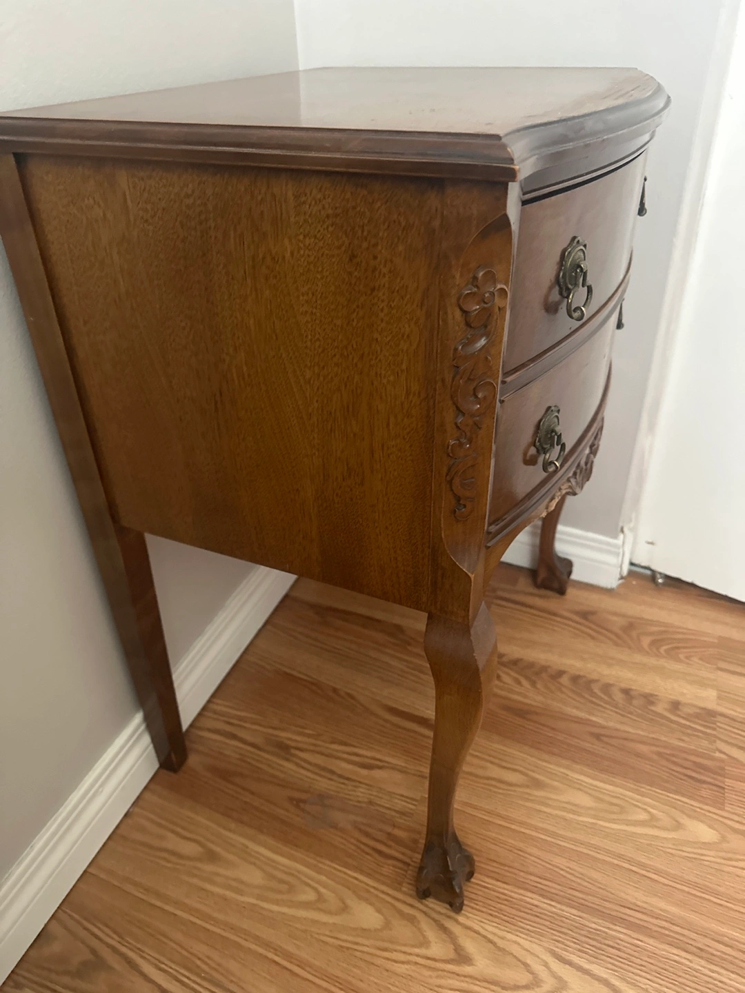 Charming vintage wooden side table. Features two drawers, ornate legs, and curved detailing. Minor damage to one leg. Includes a full set of Community silverware in the top drawer.