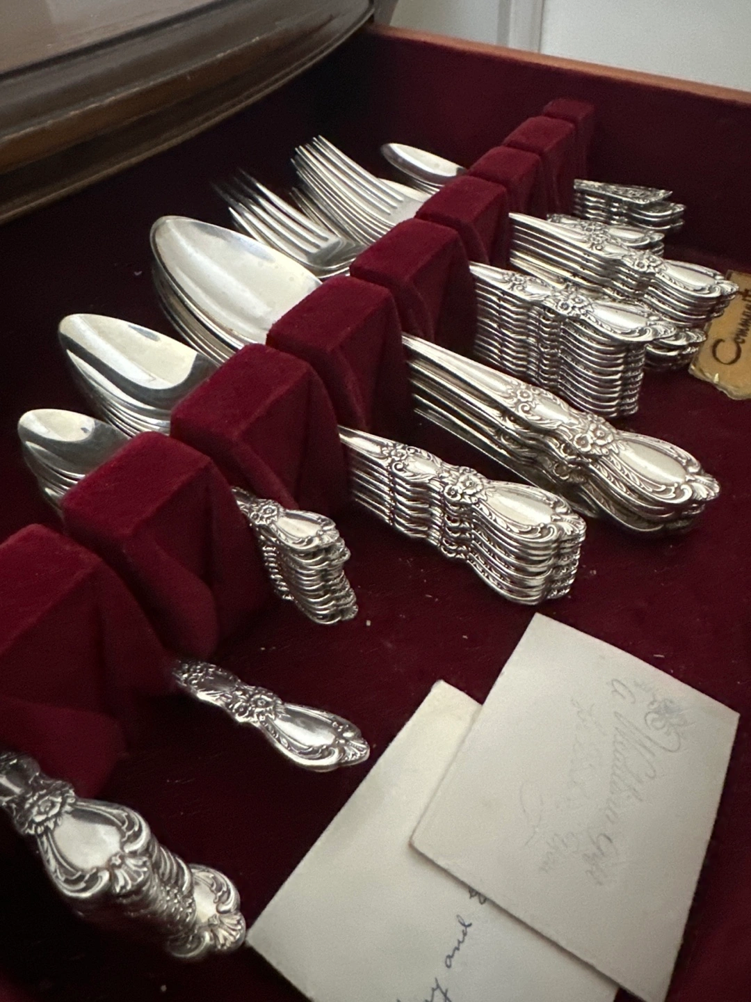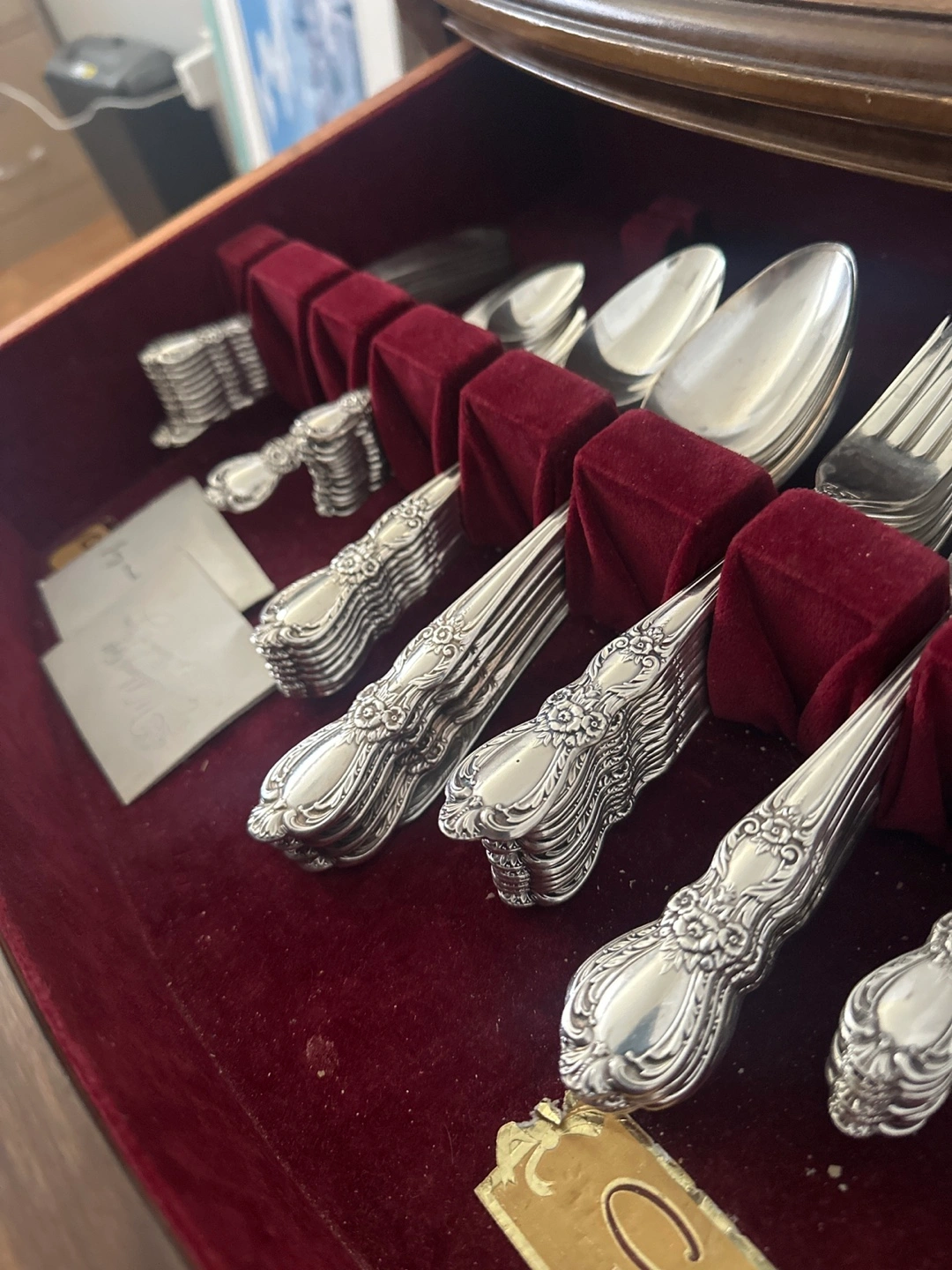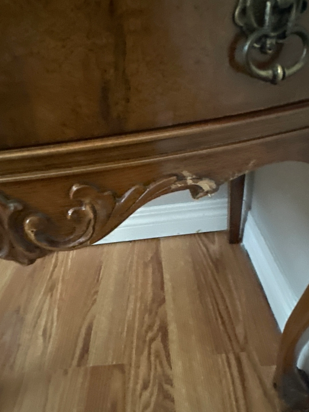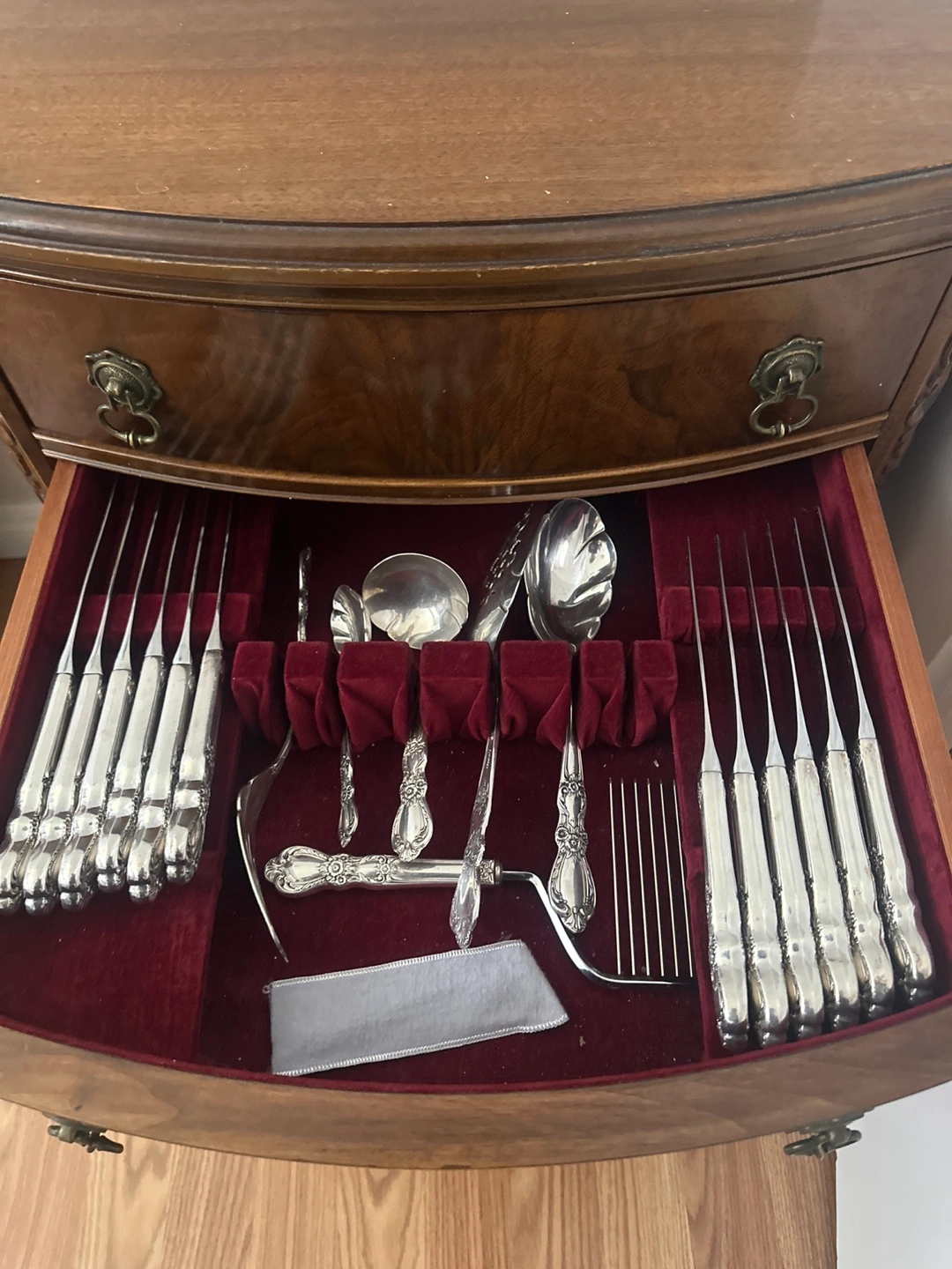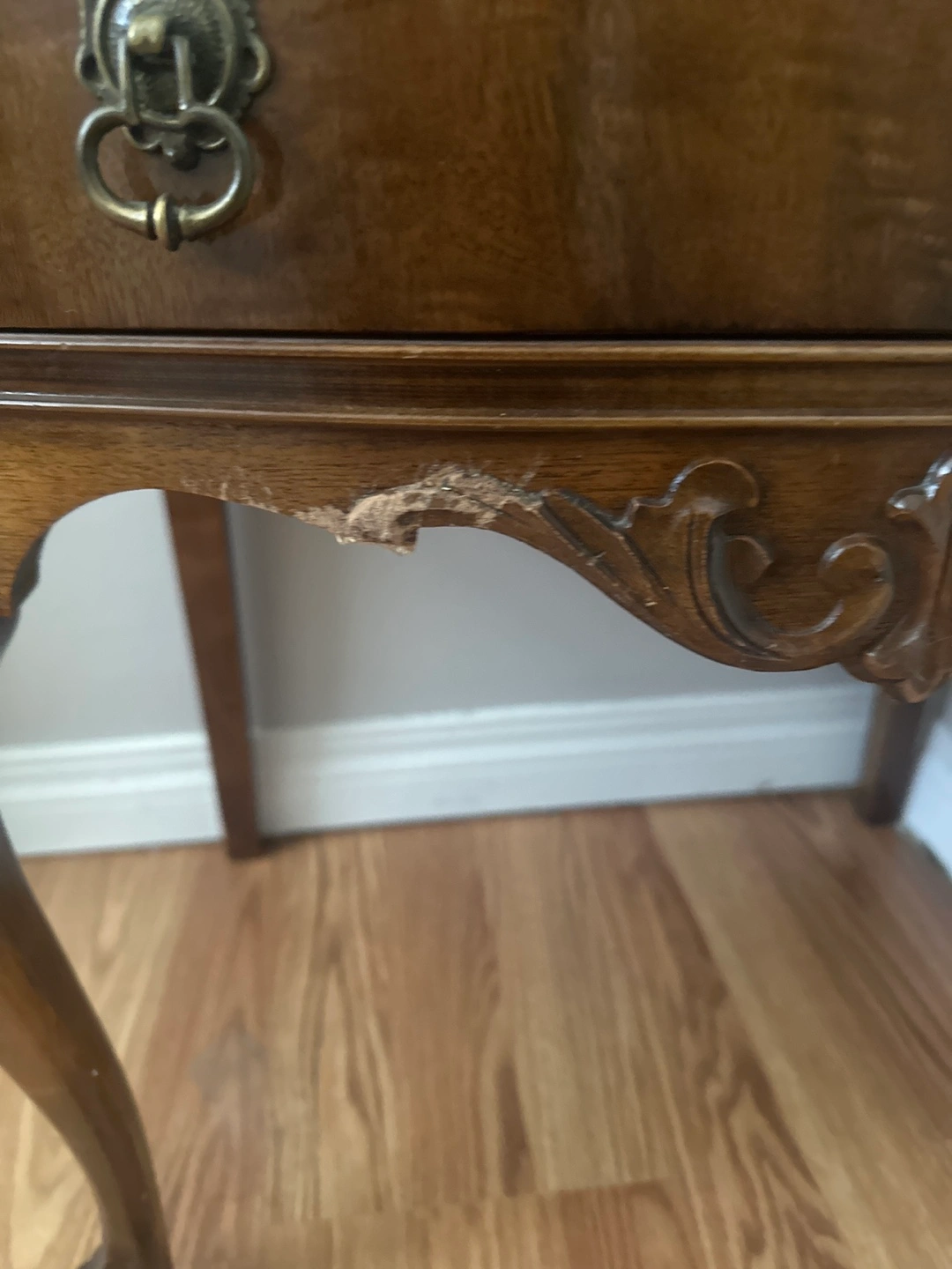 Charming vintage wooden side table. Features two drawers, ornate legs, and curved detailing. Minor damage to one leg. Includes a full set of Community silverware in the top drawer.