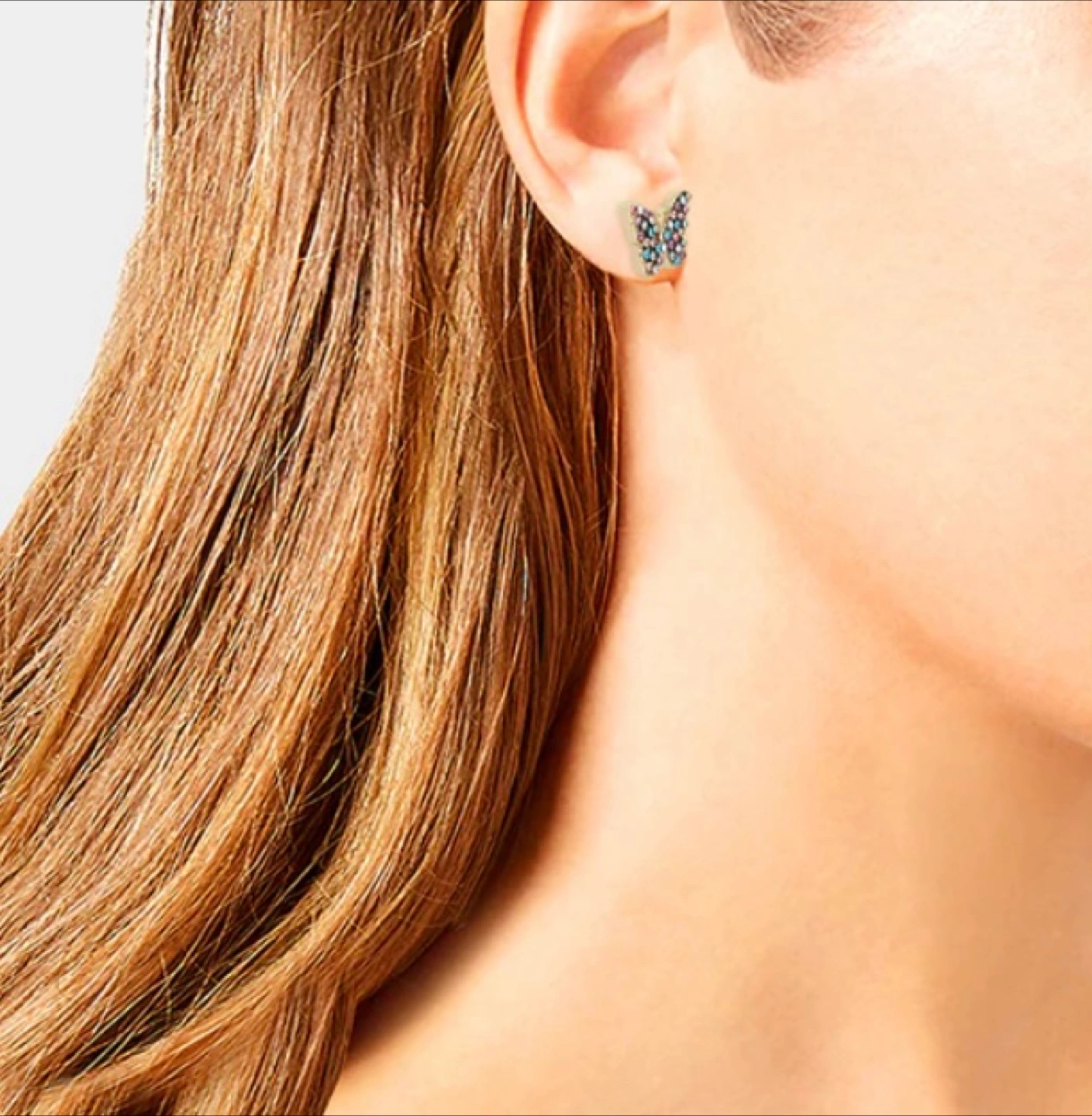 Whimsical butterfly motif stud earrings adorned with delicate pastel multi-colored stone accents. These colorful earrings are set in polished gold-tone metal and have a post back closure.