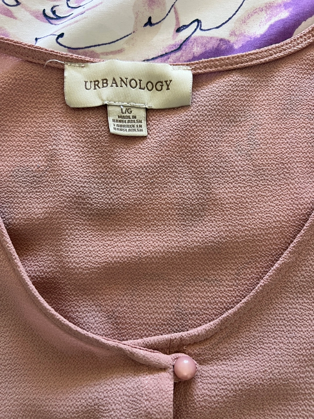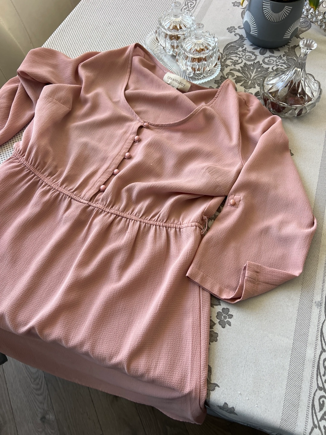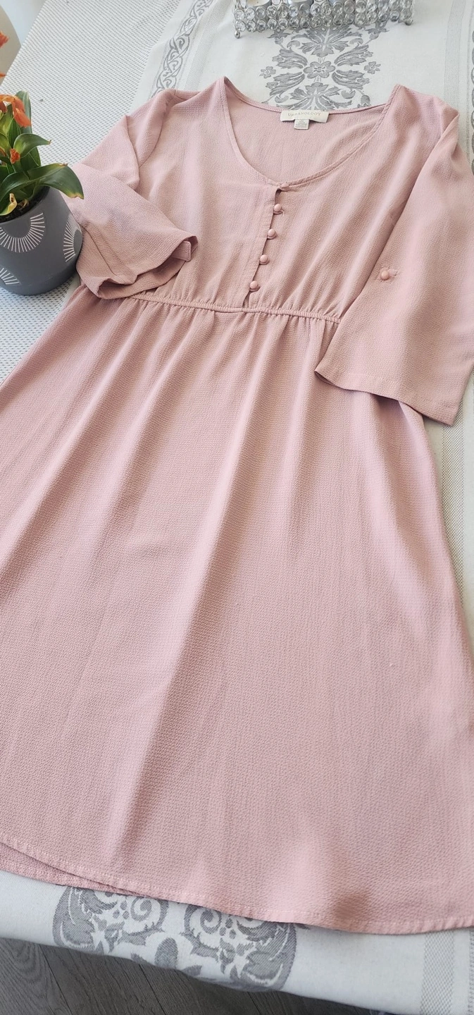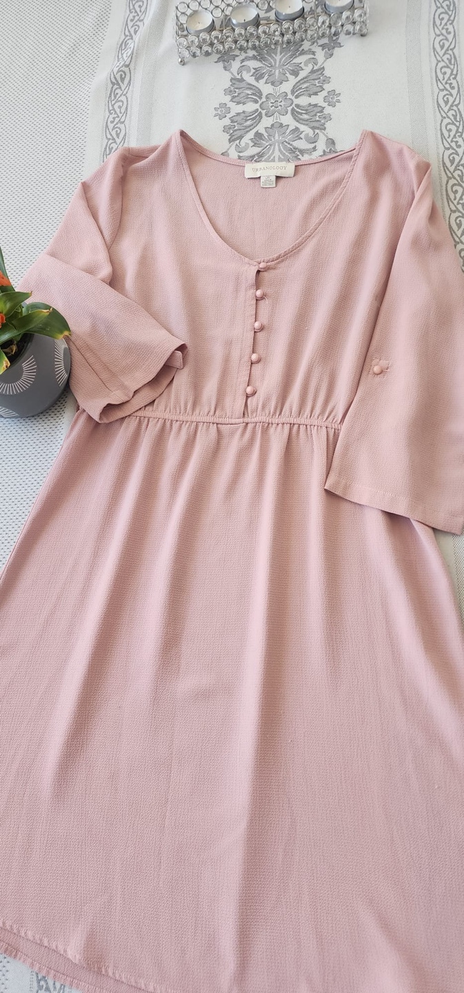 Dusty rose coloured mini dress. Features three-quarter sleeves, button detailing, and empire waist. Size large.