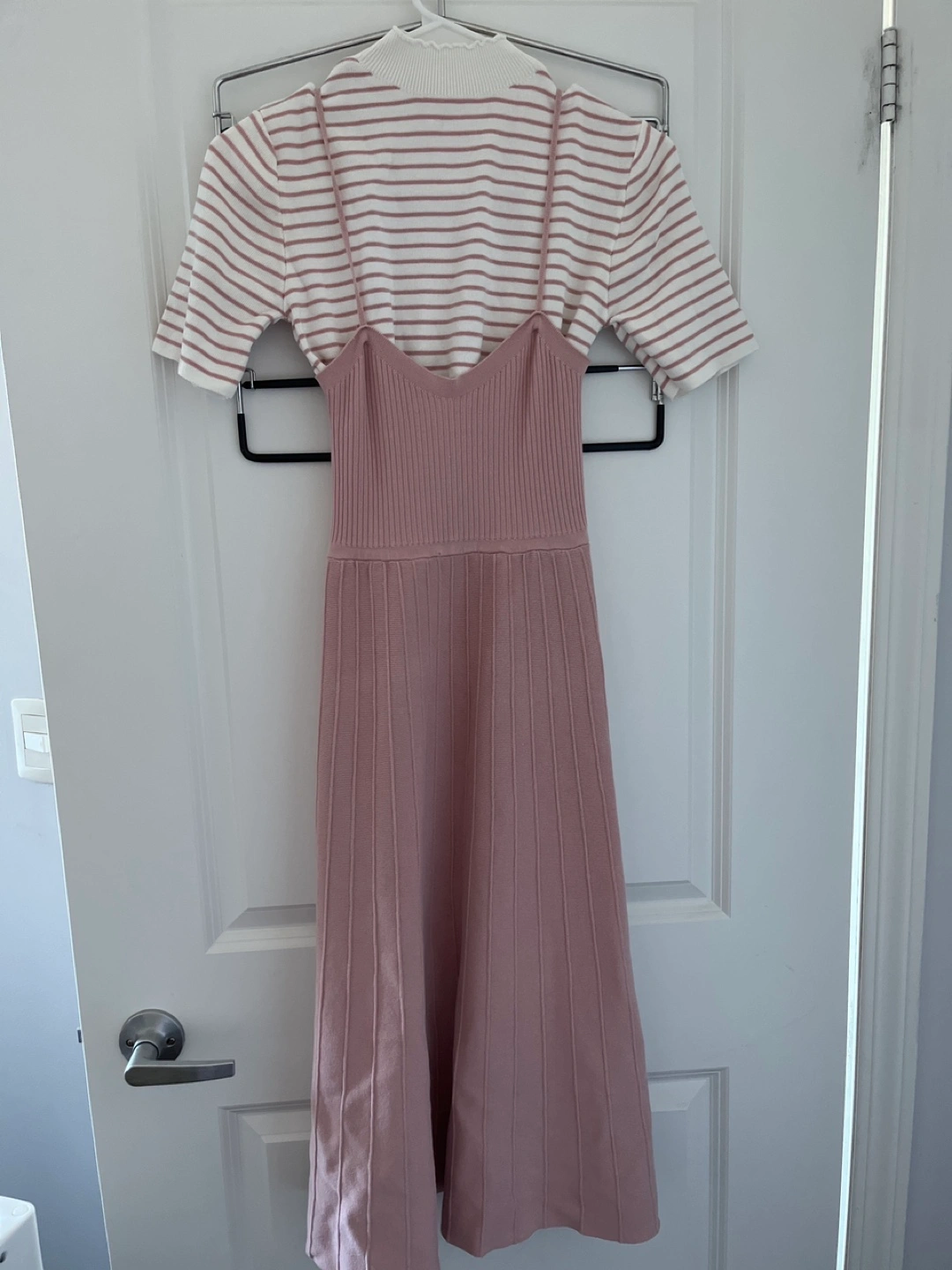 Adorable pink midi dress. Features a fitted bodice and a pleated skirt. Includes a matching striped short-sleeved top.