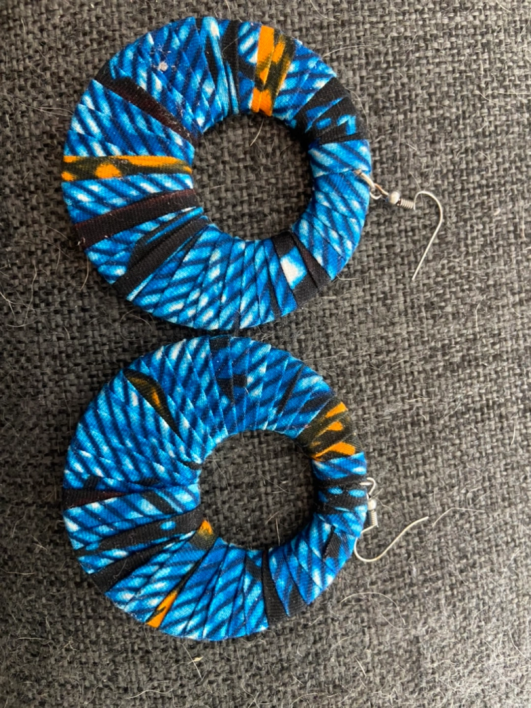 Pair of large hoop earrings. Blue, black and orange patterned fabric. Silver tone hook closures.Handmade in Uganda.