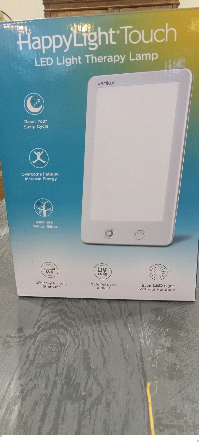 LED light therapy lamp. Customizable light therapy experience. Three brightness level settings. Choose warm or cool light. Clinically proven strength. Safe for eyes and skin. Even LED light without hot spots. Reset your sleep cycle. Overcome fatigue. Increase energy. Alleviate winter blues. Product dimensions: 16cm W x 26cm H. Cash at pick up please.
