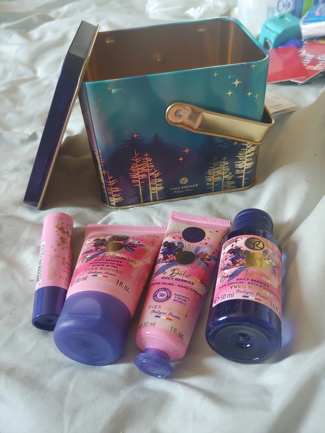 New Yves Rocher gift set. Includes hand cream, shower gel, and lip balm. All in a collectible tin. Perfect for gifting.