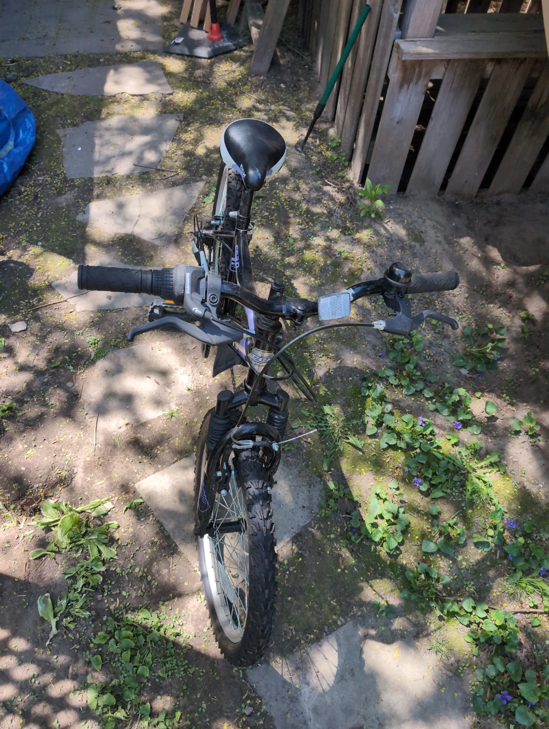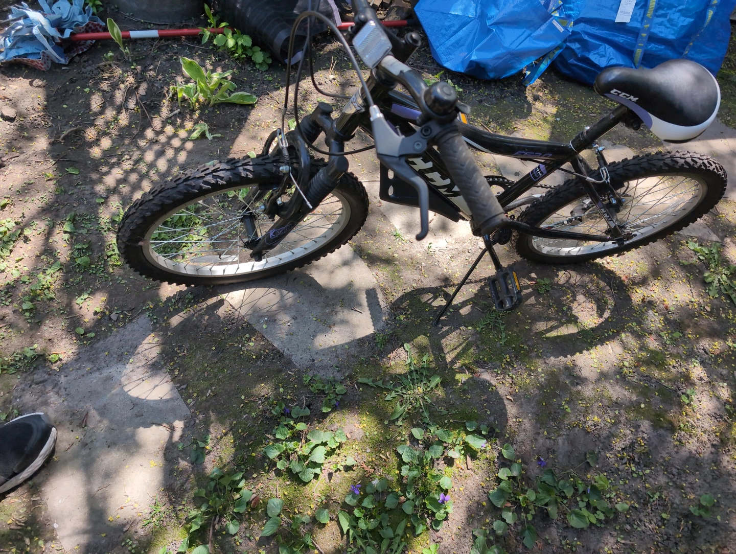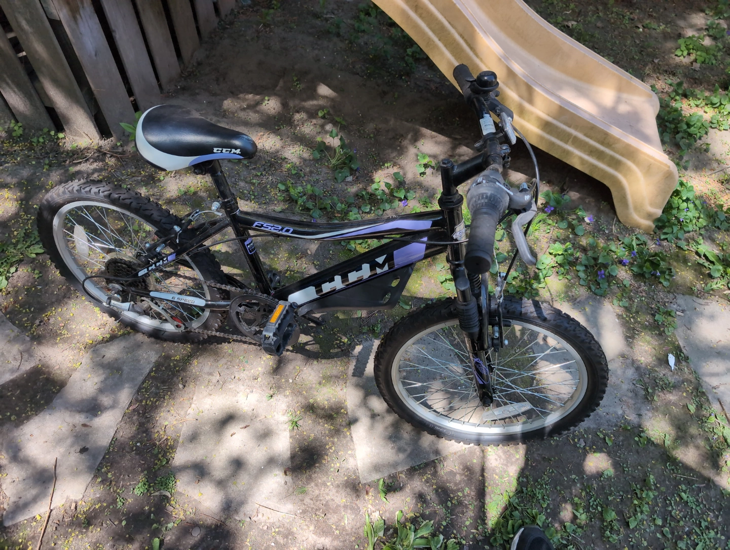 Used HM PS20 girls' bicycle. Black frame with purple accents. Features front suspension and CCM saddle. Ready for a new rider!