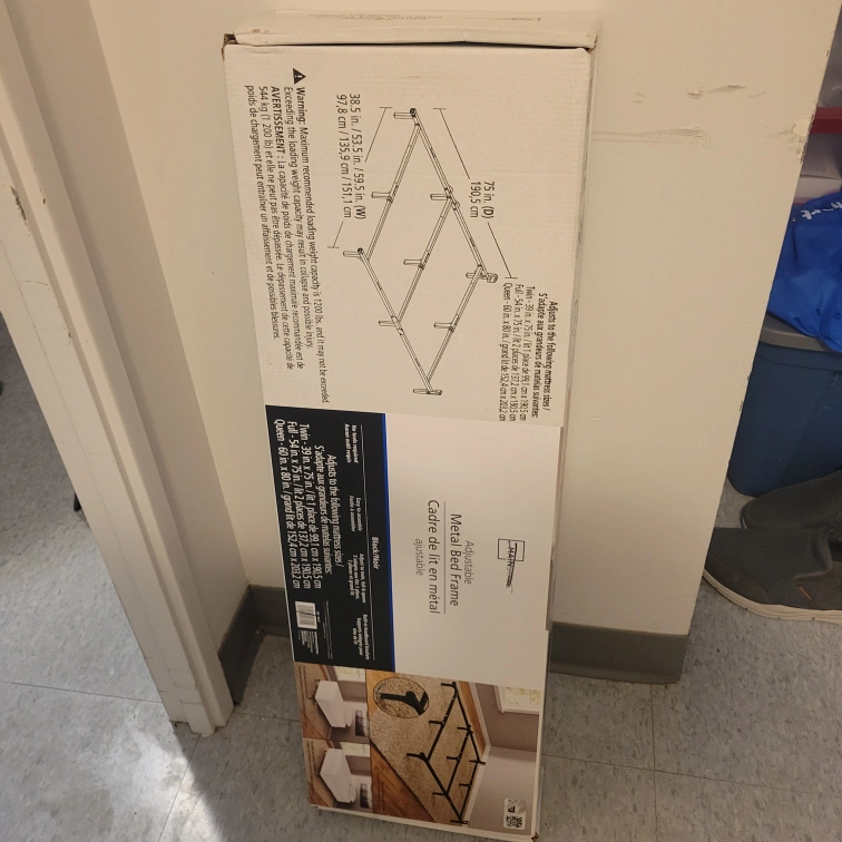 Metal bed frame. Adjusts to twin, full, or queen frame. Black colour. New in box.