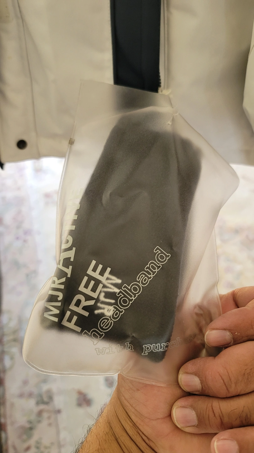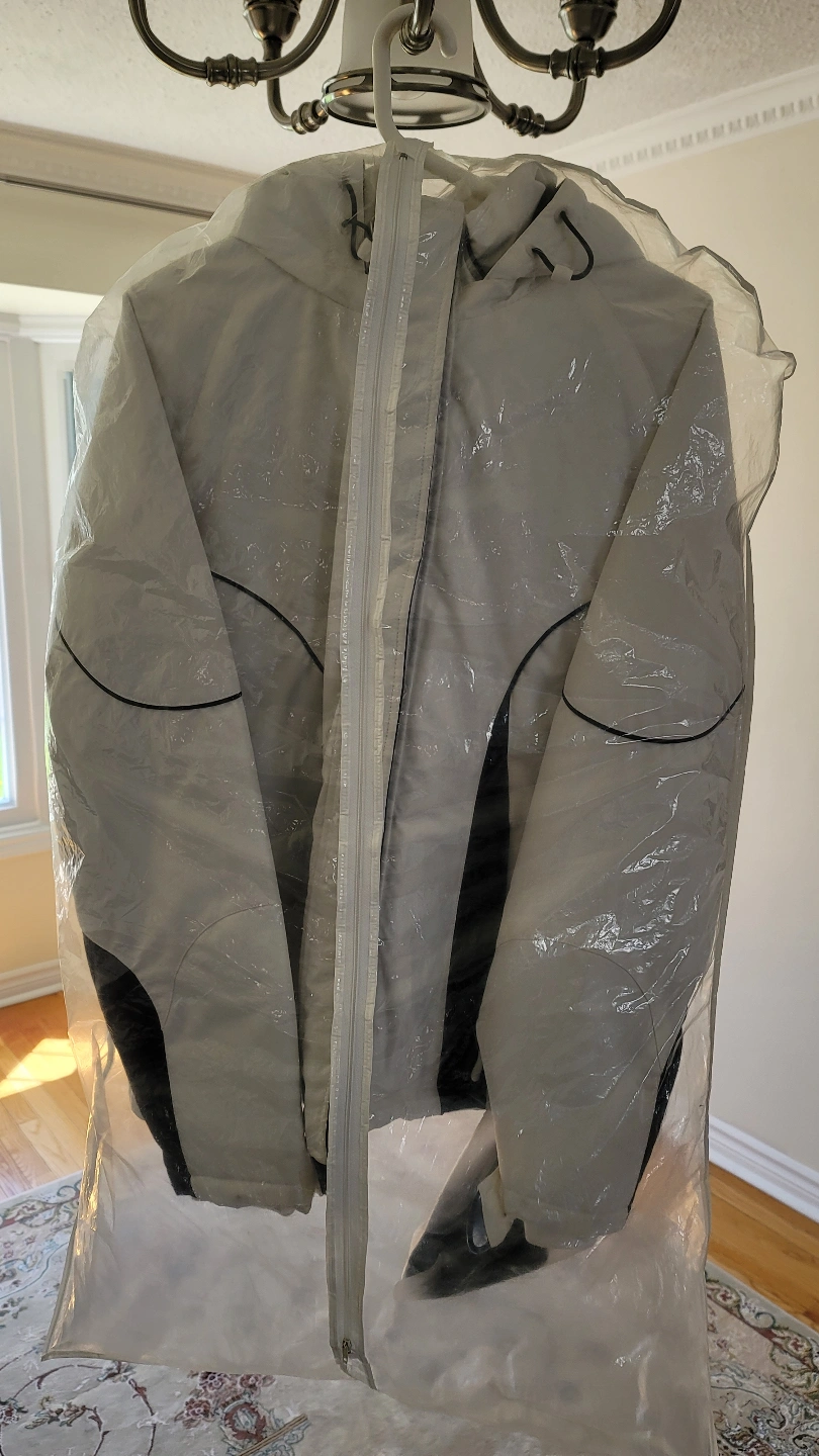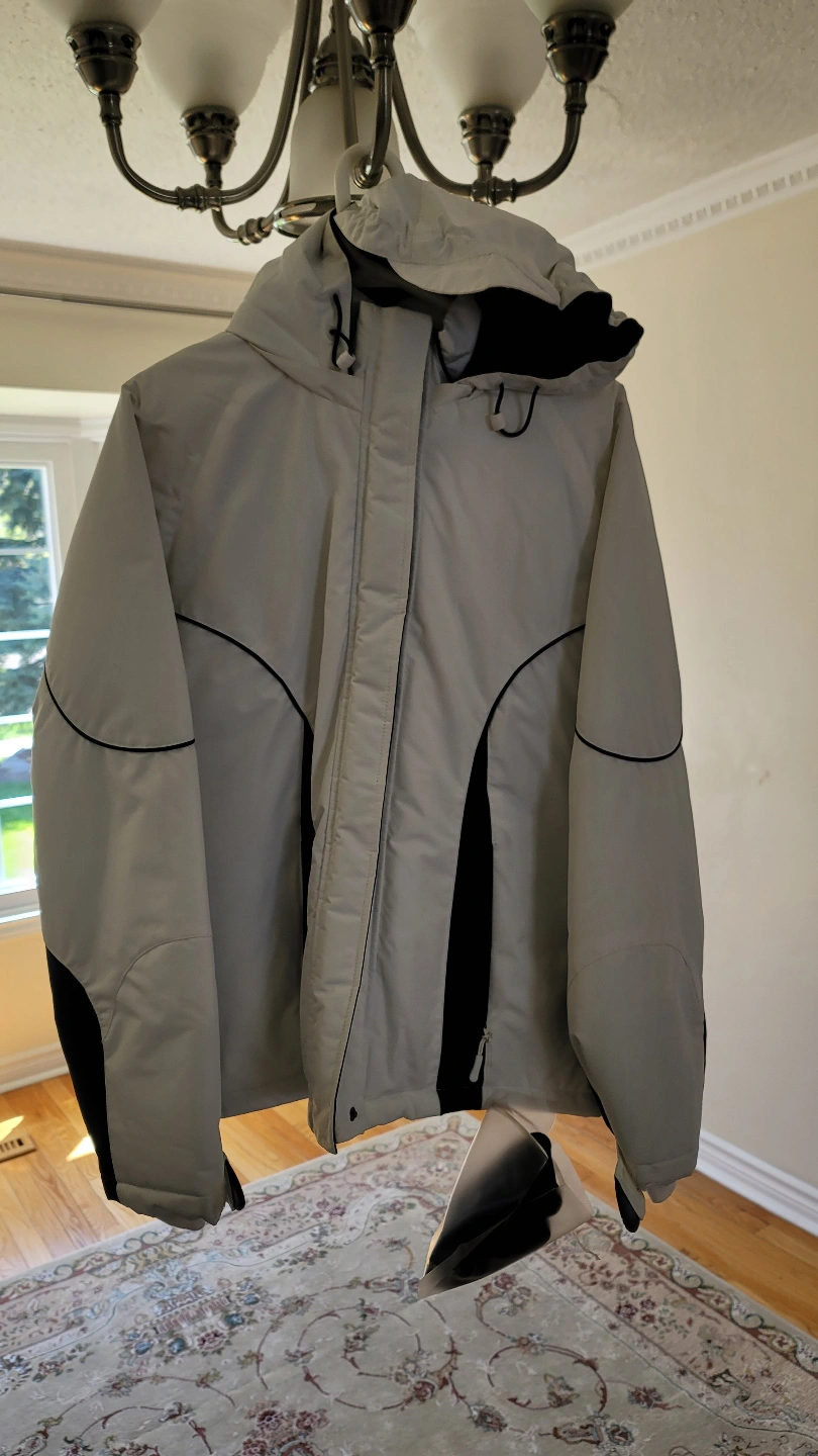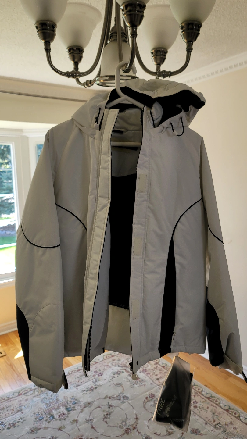 Brand New - Women's hooded ski jacket. Light beige with black accents. Size large. Includes free headband.
