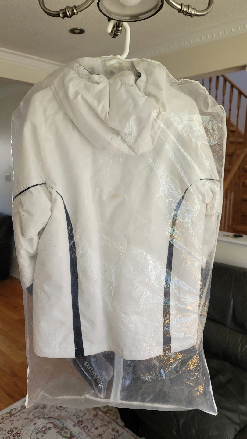 Has a small stain on the back which can be easily removed when washed. Jacket has never been used.