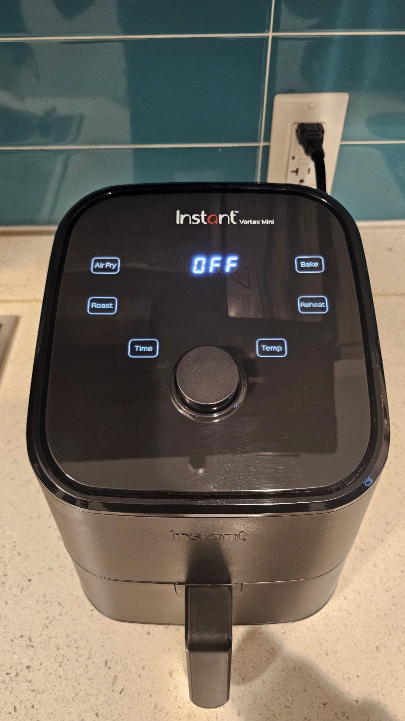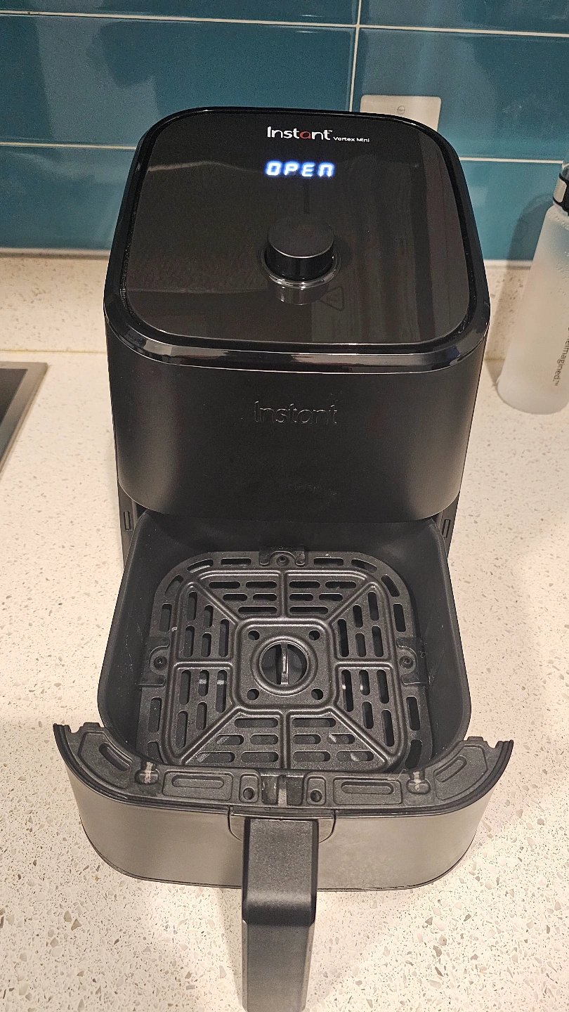 Black Instant Vortex Mini air fryer. Features air fry, roast, bake, and reheat functions. Compact size, ideal for smaller kitchens. Includes basket.