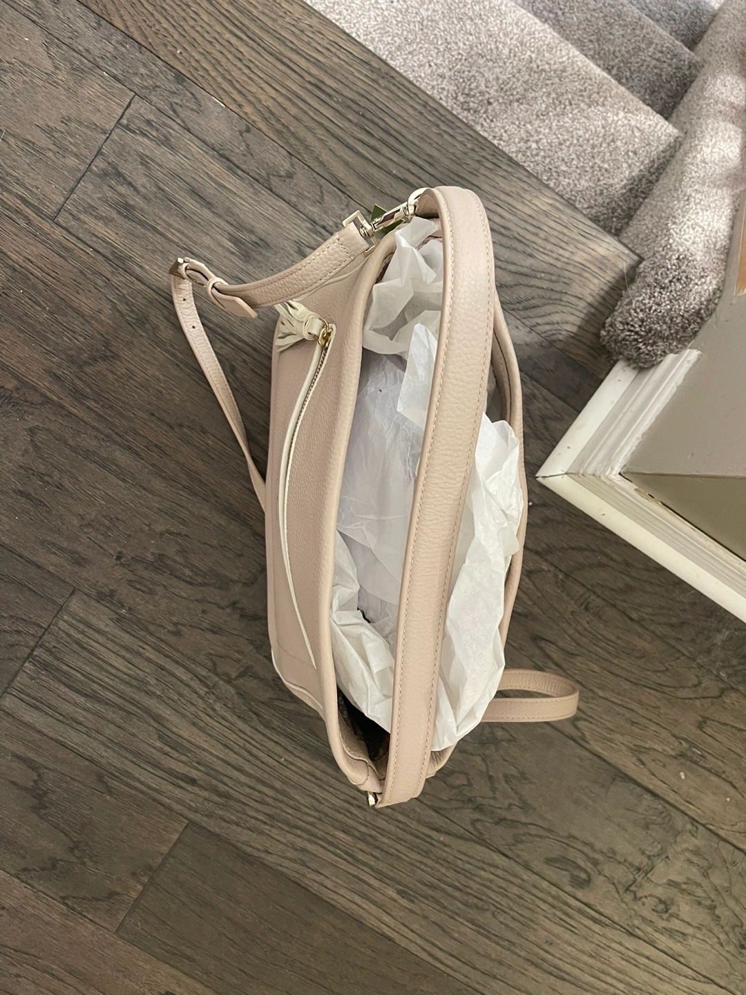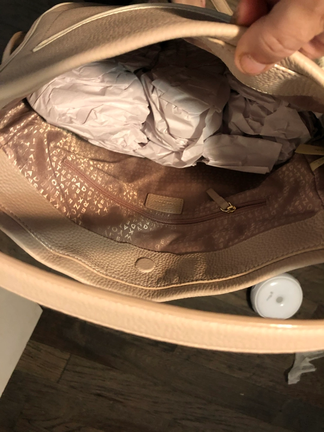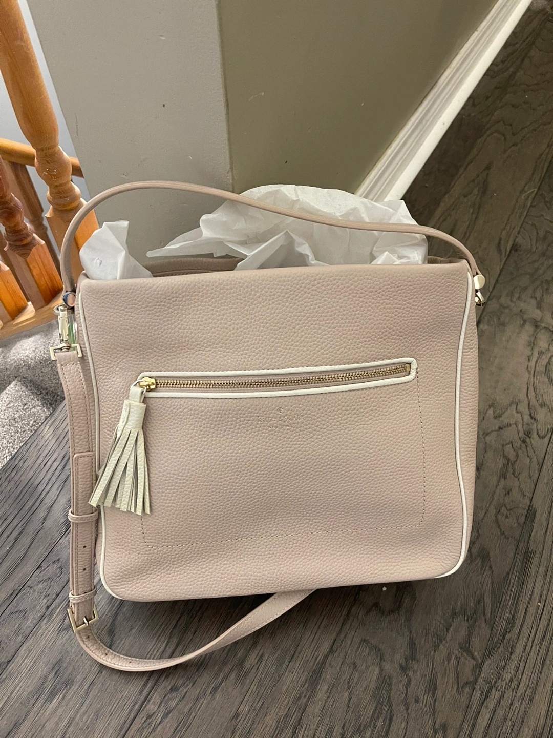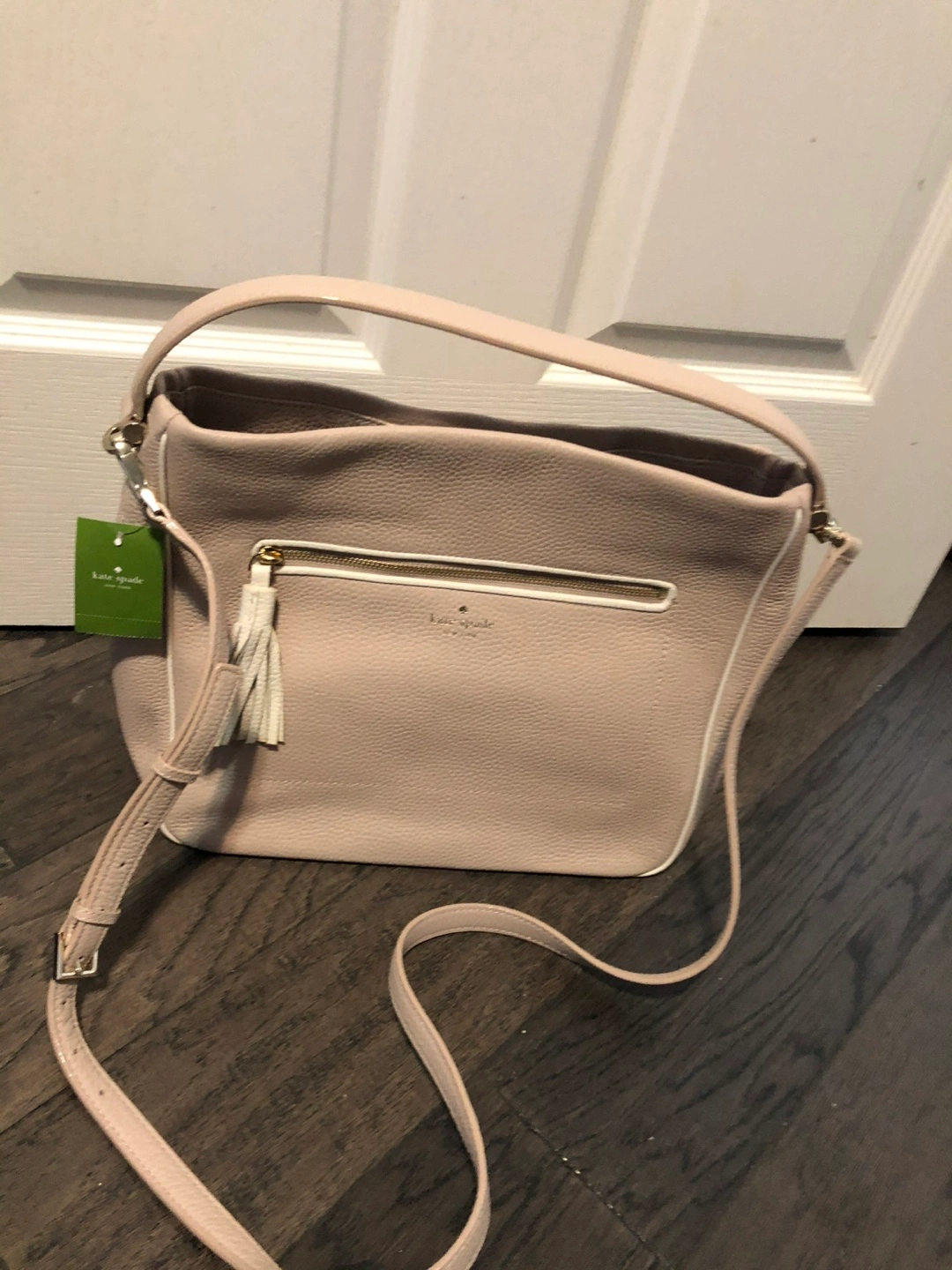 72Beautiful leather shoulder bag. Features a tassel detail and zip closure. Adjustable strap. Interior lining features Kate Spade logo.