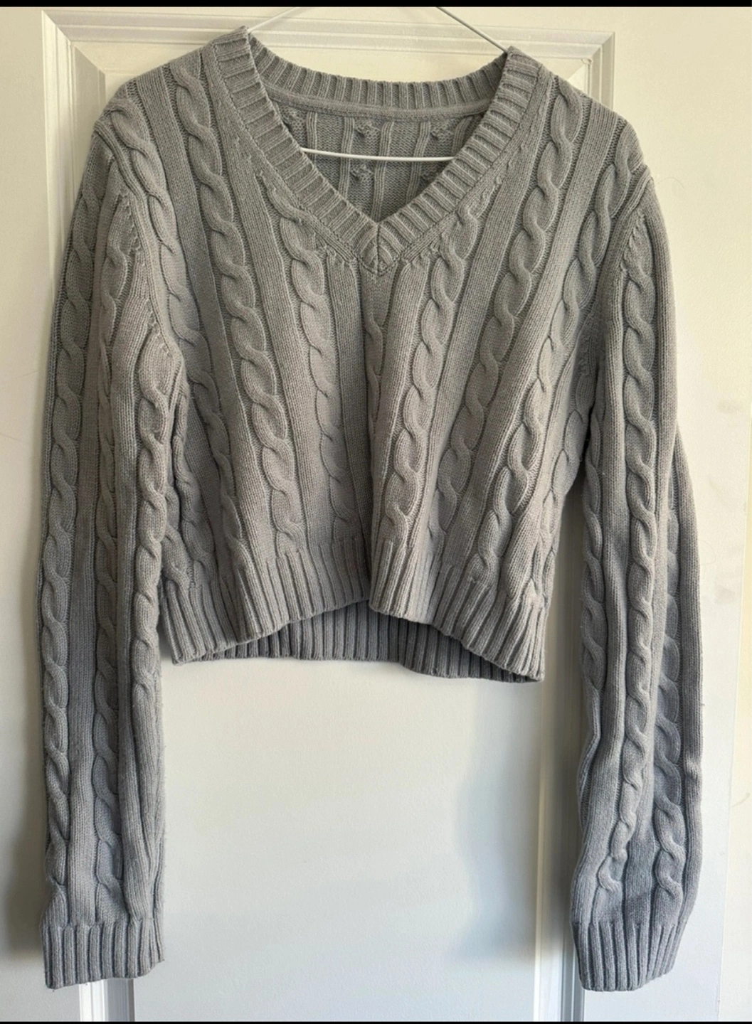 Light blue (in the picture looks grey) cropped wool sweater. V neck. Retails for 110$, on the website https://www.aritzia.com/en/product/moss-sweater/100936.html?dwvar_100936_color=10230