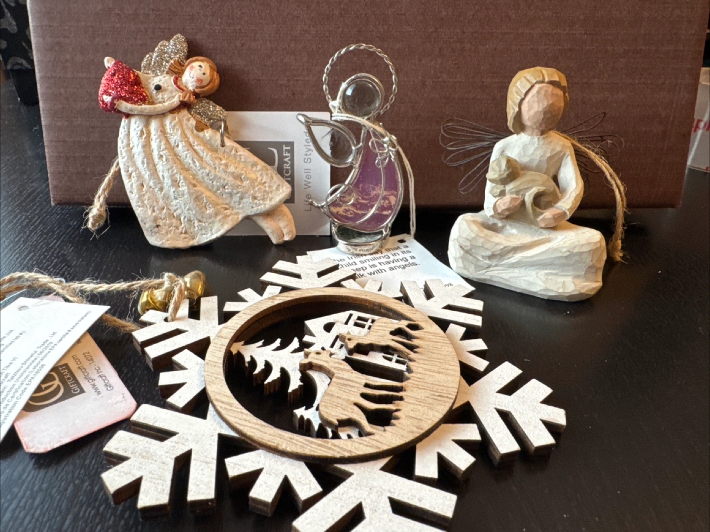 Set of four angel & holiday ornaments. Includes a Willow Tree angel figurine, a stained glass angel, a glitter angel, and a wooden snowflake ornament. Perfect for Christmas decorating.