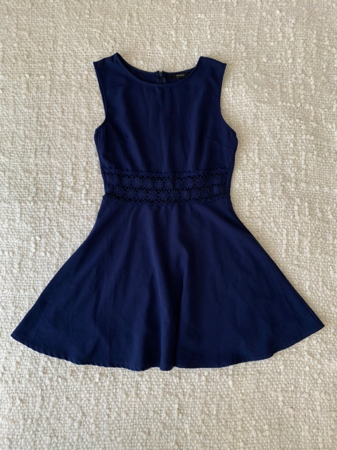 Beautiful navy blue fit and flare dress. Features a see-through crocheted waist detail.