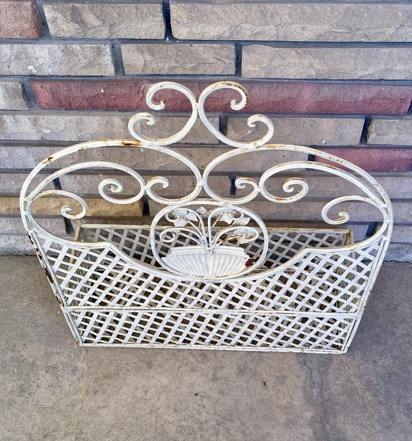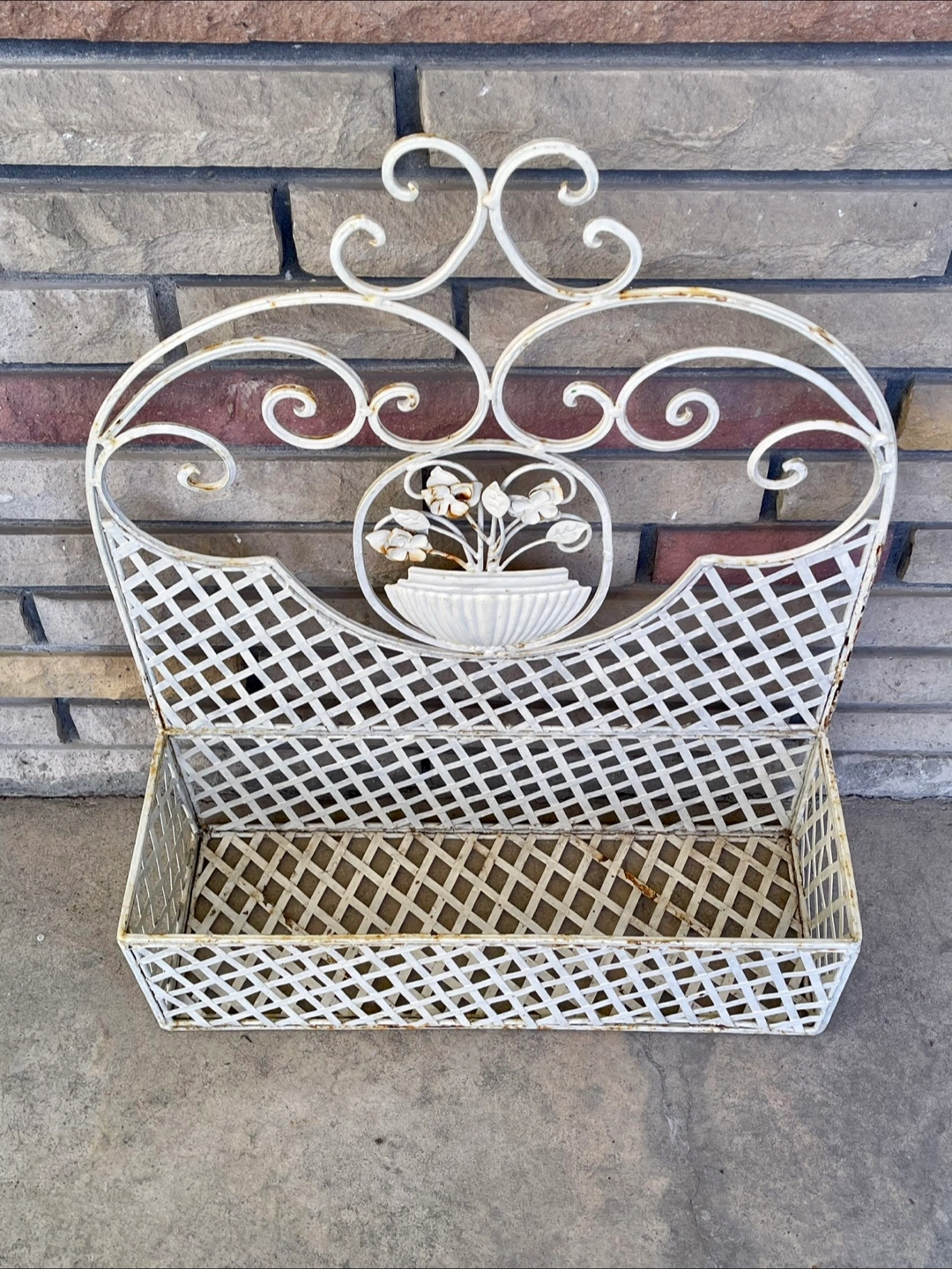 174Ornate metal wall planter. White finish. Floral detail. Great for herbs or small flowers. Shows some minor wear. Give it a fresh coat of paint or use as is for shabby chic decor.