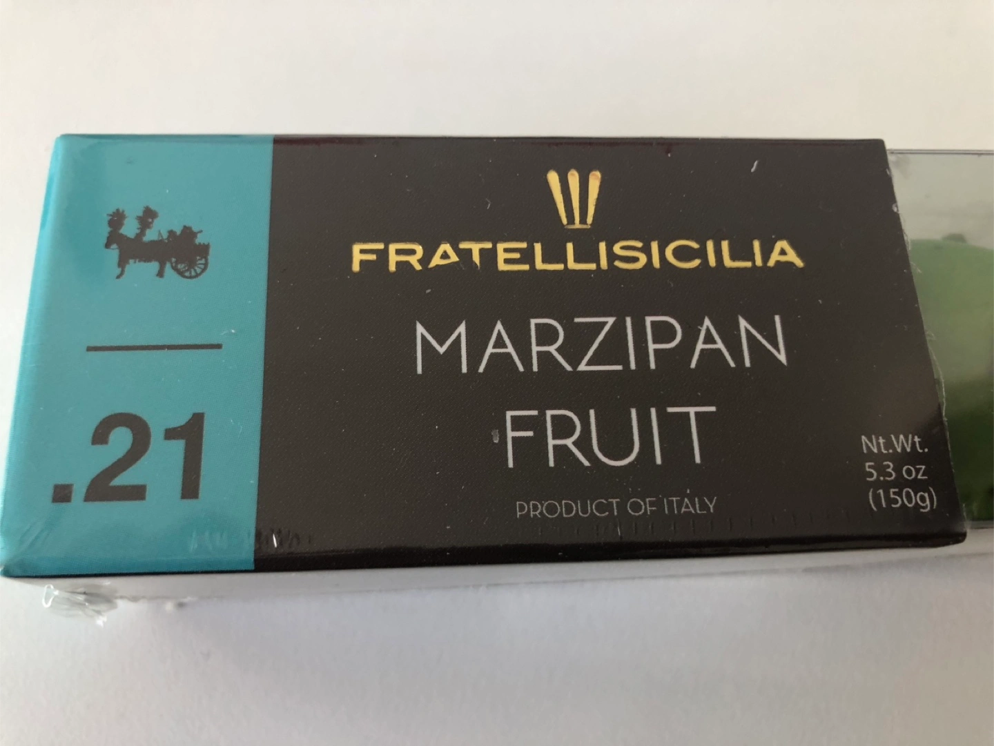 52Box of marzipan fruit. Product of Italy. 5 pieces. With flavours appear to be apple, orange, and strawberry.