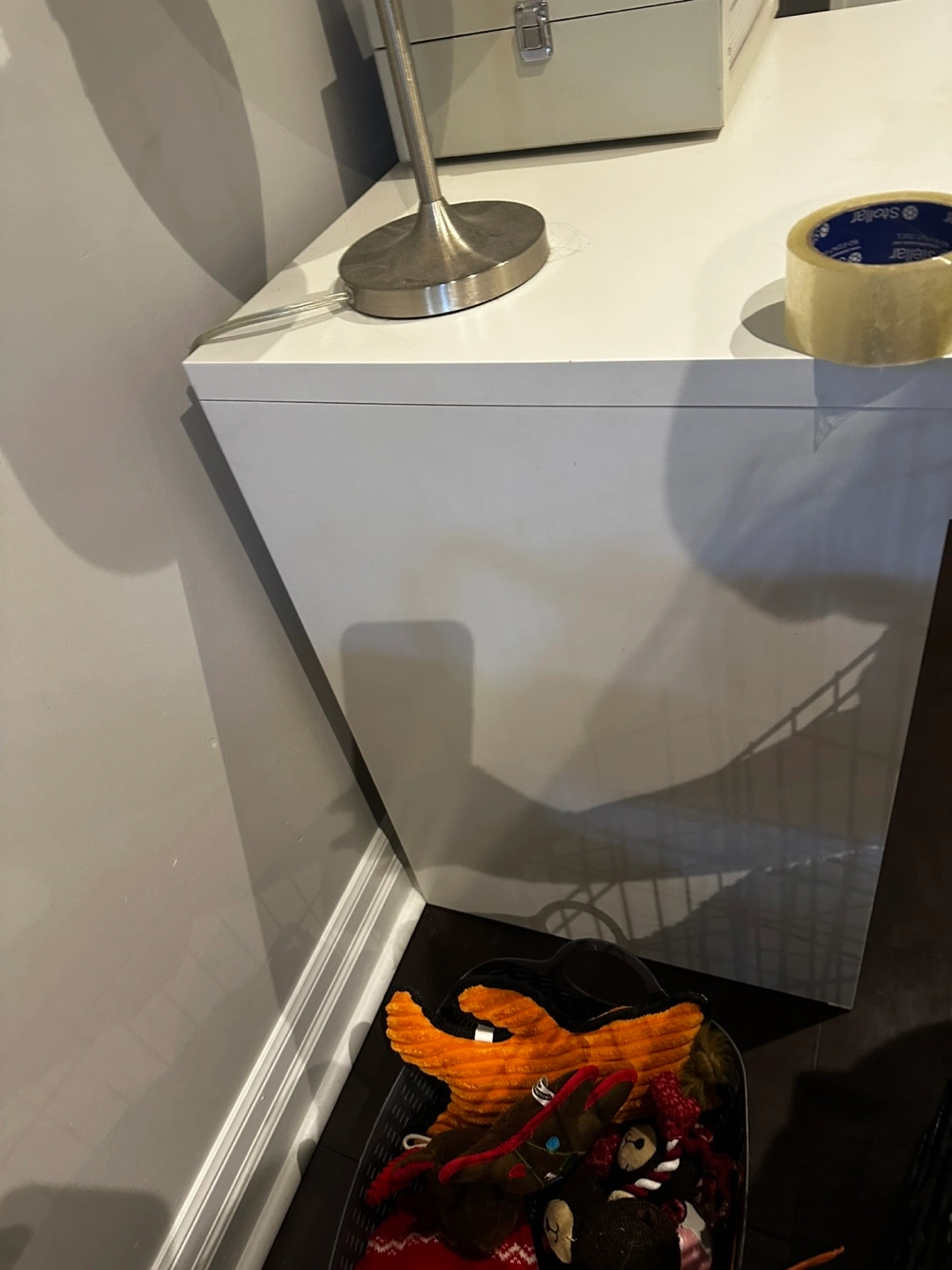 Small white desk from IKEA, with hole for wires and cables. One drawer. Minimalist design. Good for small spaces. Some minor wear, just needs to be cleaned.
