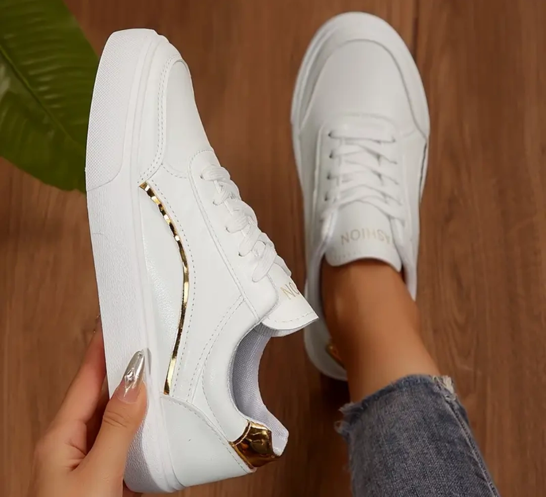 Stylish women's casual sneakers. White leather-look upper. Gold accents. Lace-up closure. Comfortable and fashionable footwear. Perfect for everyday wear.
