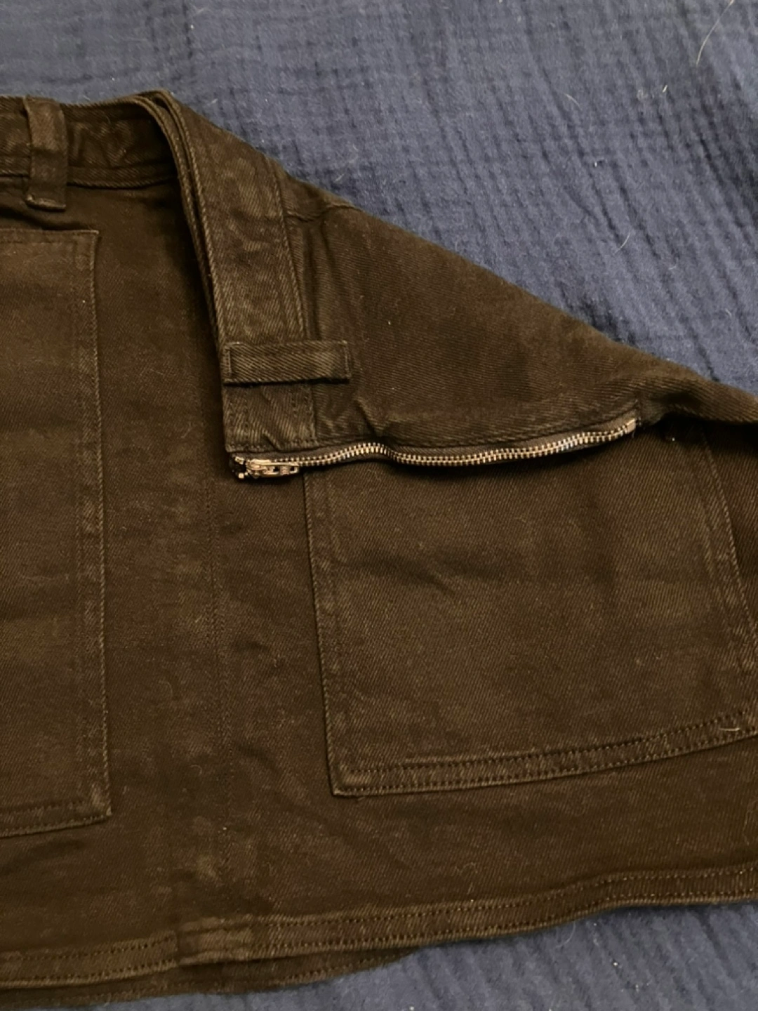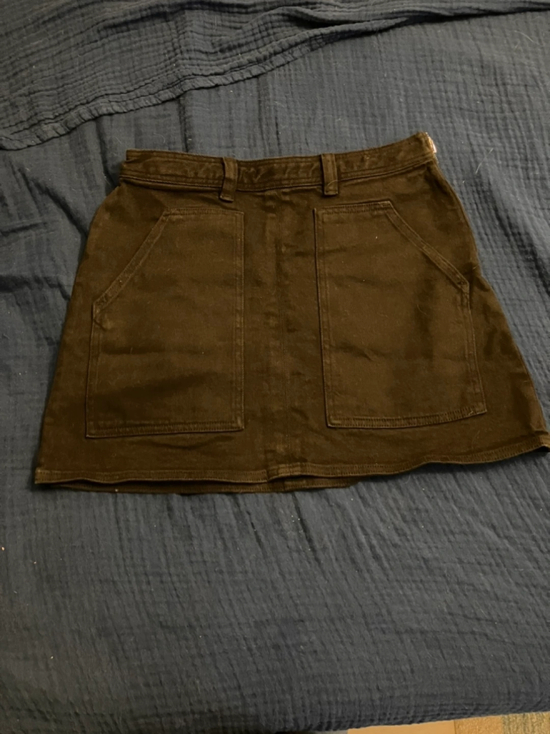 Black denim mini skirt.