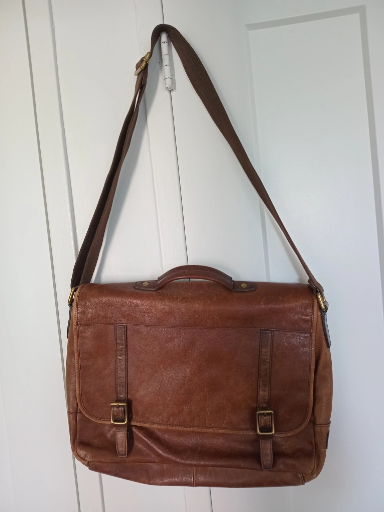 Brown leather messenger bag. Features adjustable shoulder strap and multiple compartments. Great for everyday use or work.