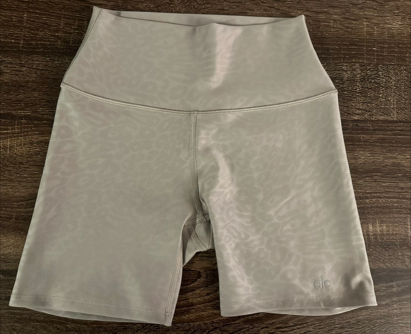 Alo Yoga high-waisted bike shorts. Size XS/TP. Light grey with a subtle leopard print. Made in Vietnam. Stretchy and comfortable material. No Tag