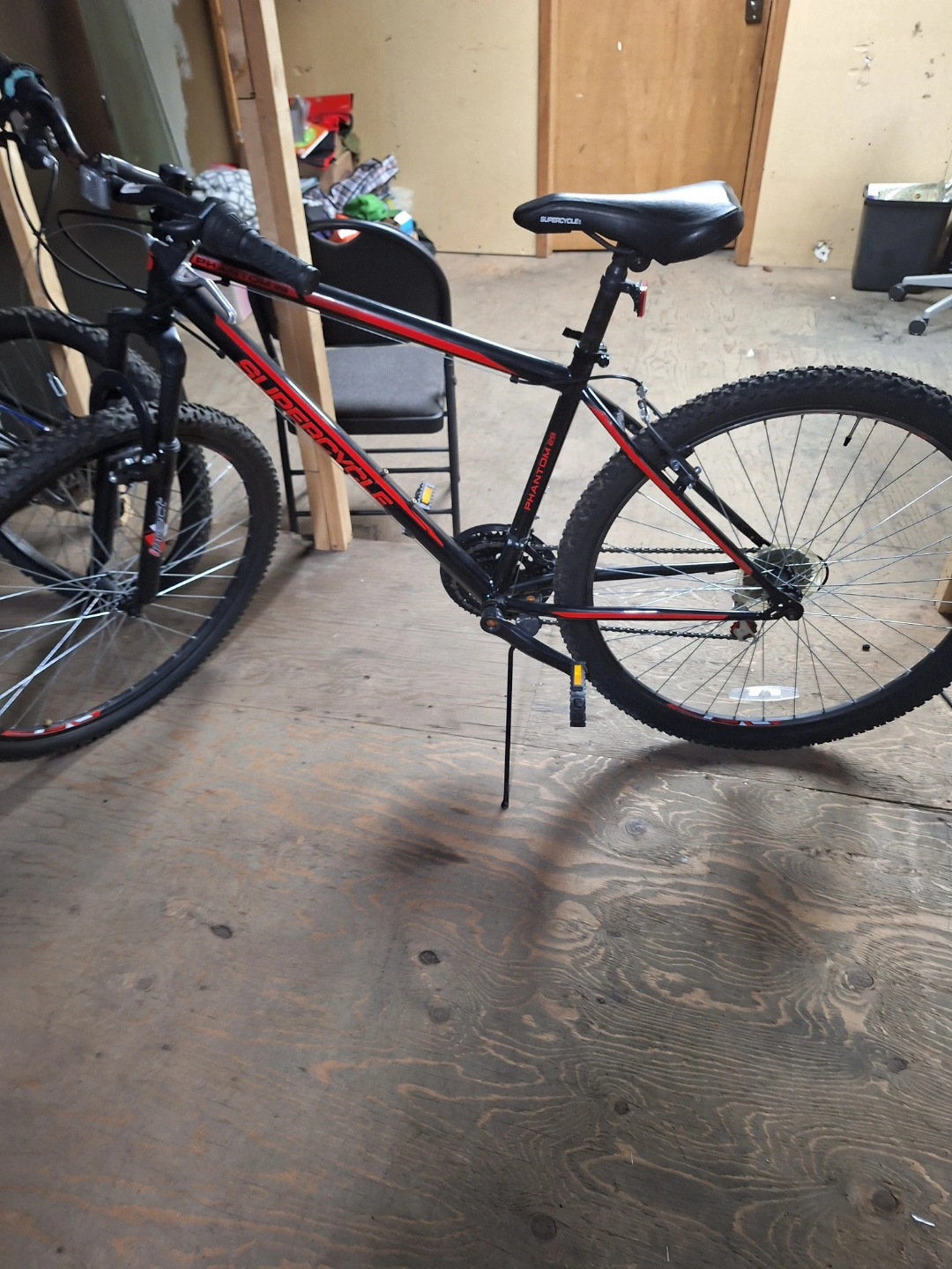 Men's mountain bike. Black and red frame. 26" wheels. Front suspension forks. Hand brakes. Kickstand included. front brake needs fixing, brake pads are new just the wire needs tightening.