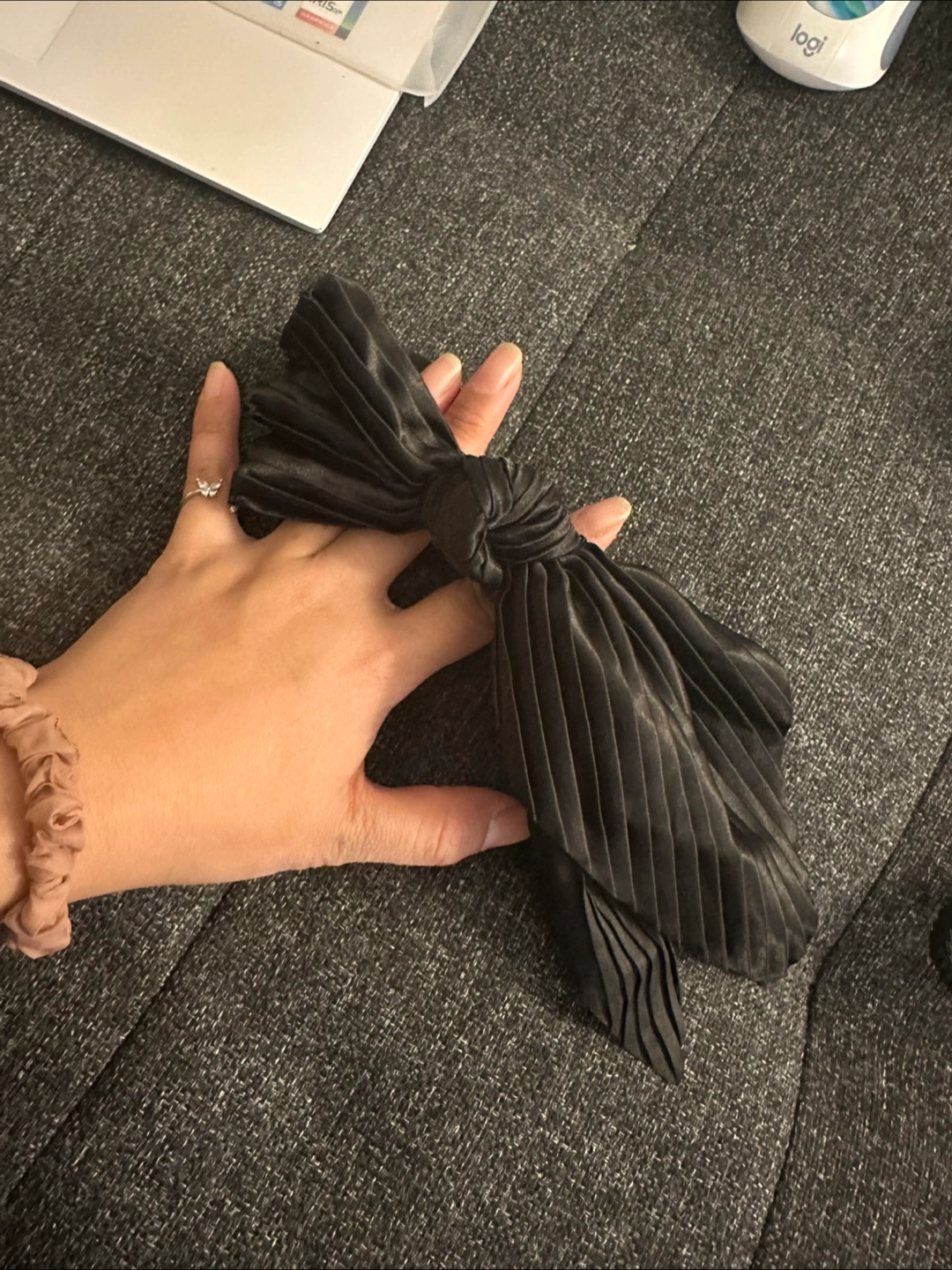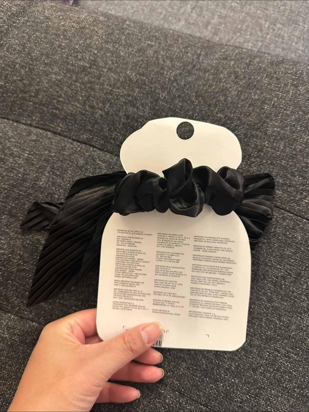 119Large black scrunchie. Pleated fabric. Perfect for adding a touch of elegance to any hairstyle.