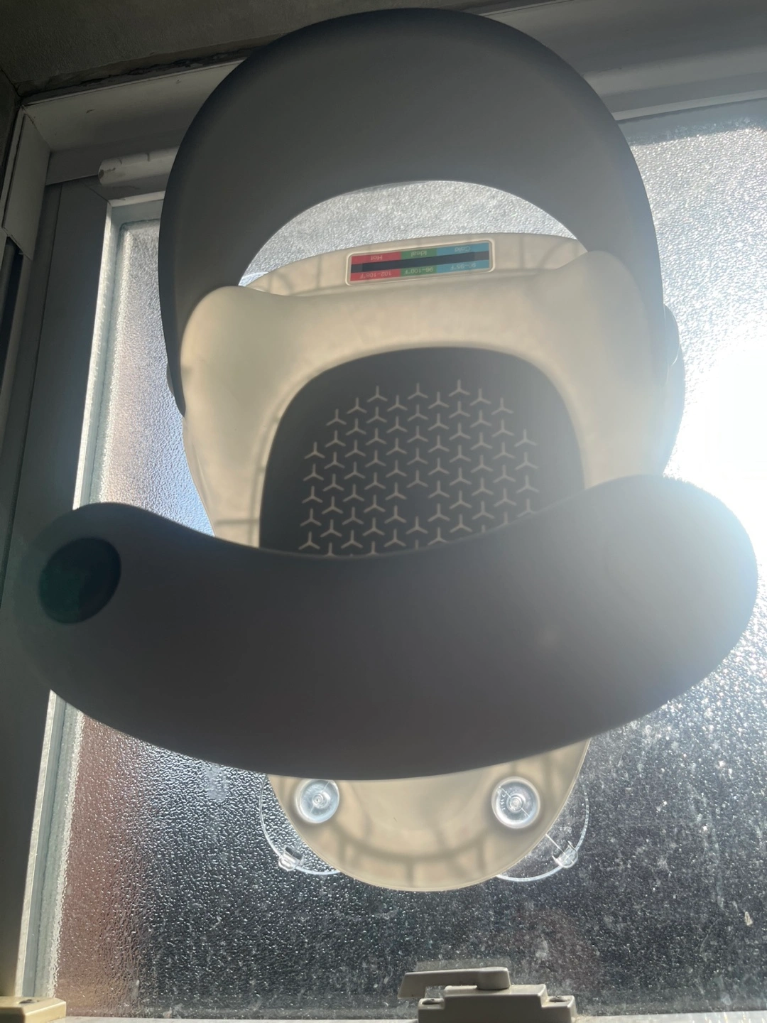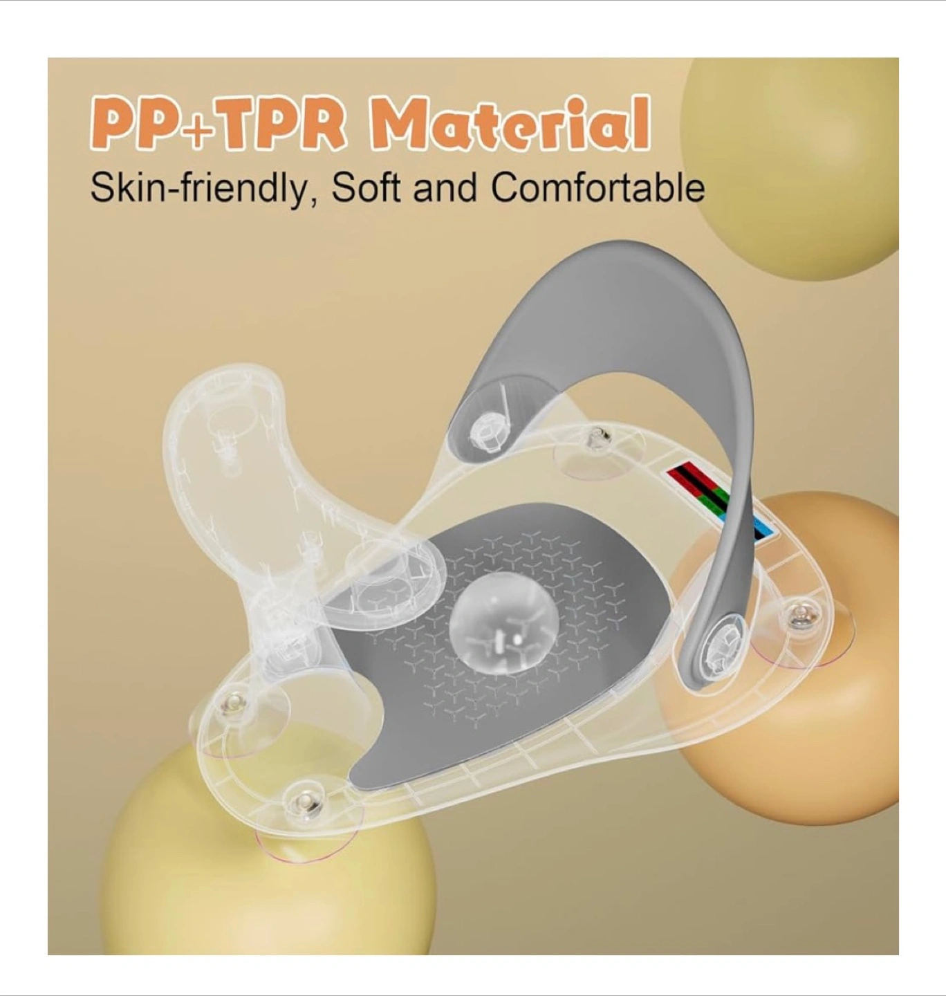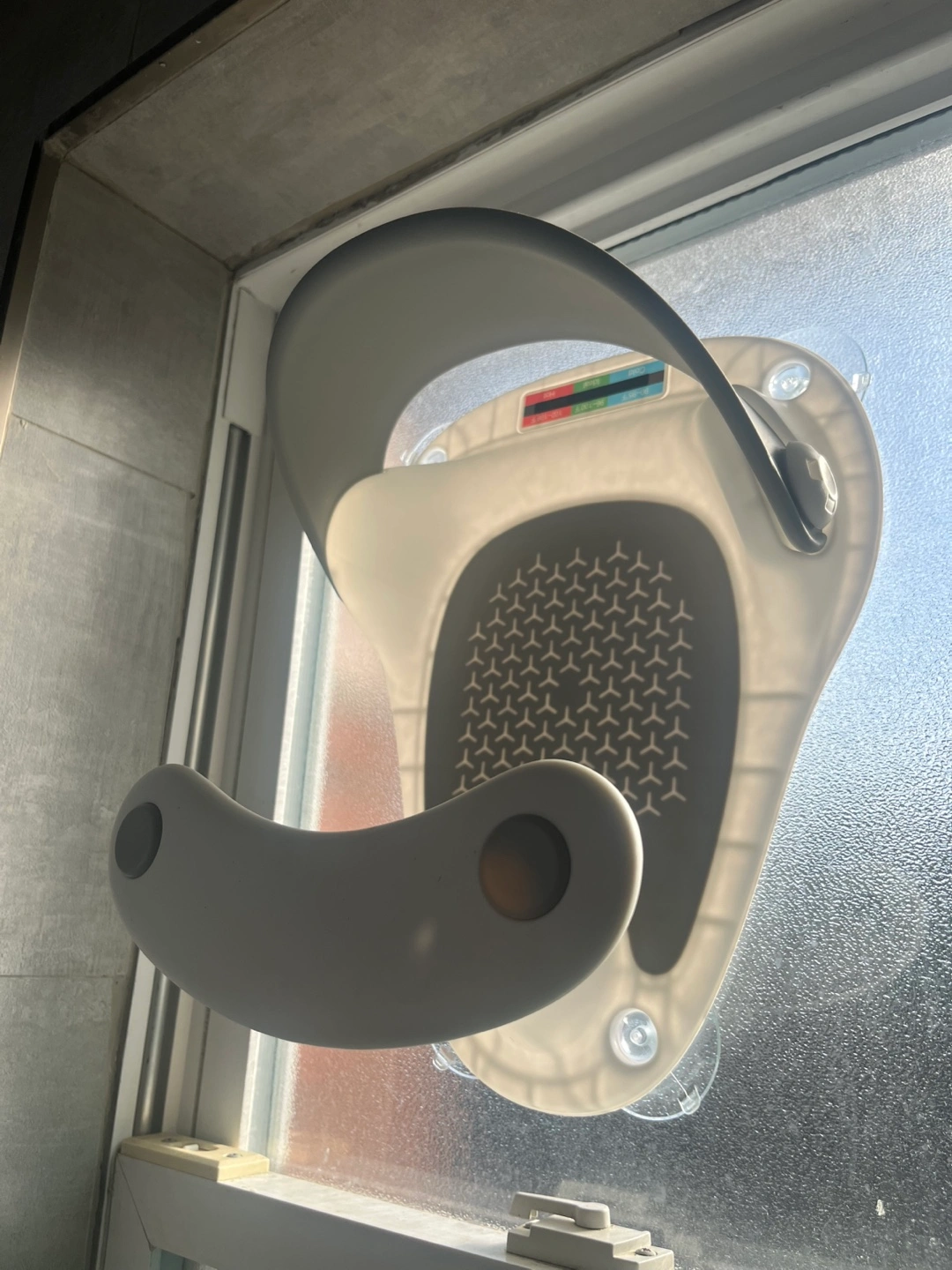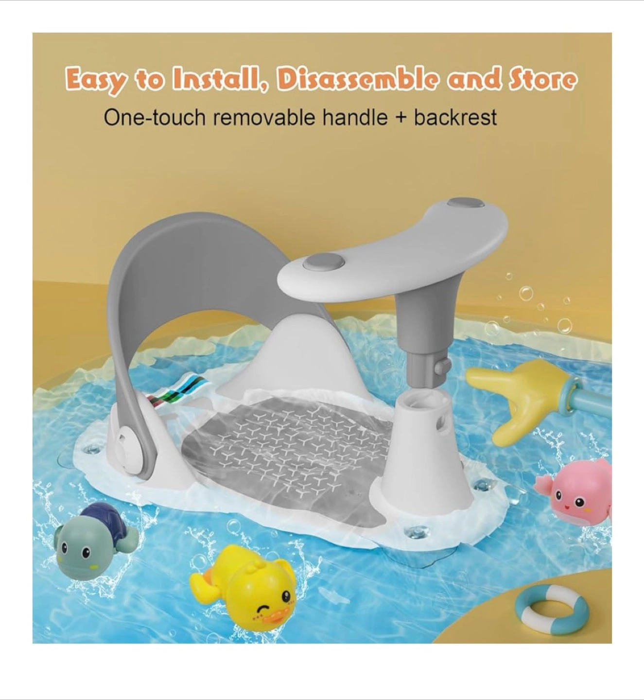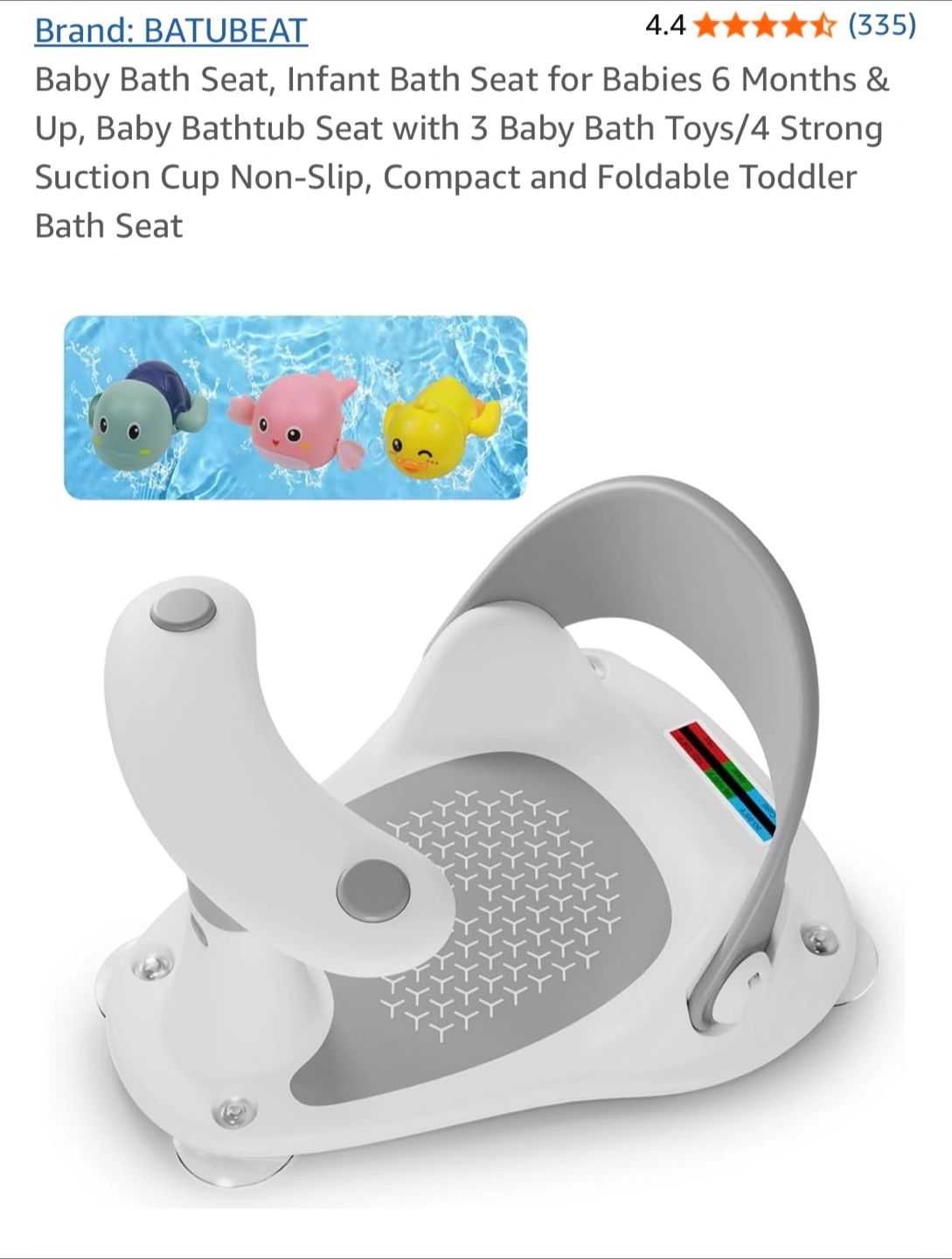 Baby bath seat. For babies 6 months and up. Four strong suction cups. Compact and foldable. Non-slip.
