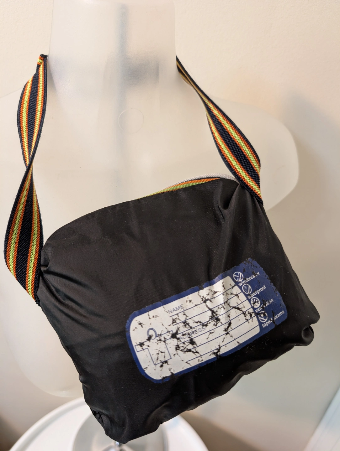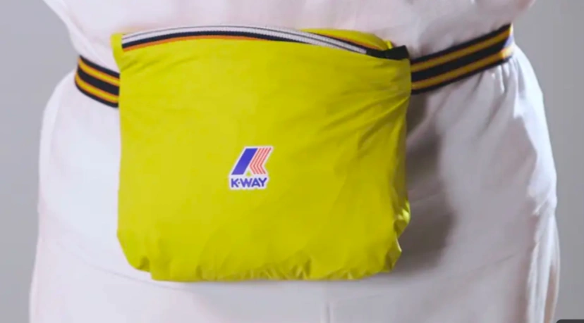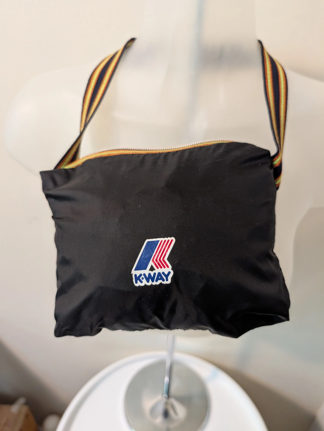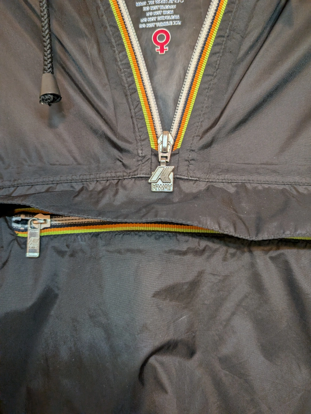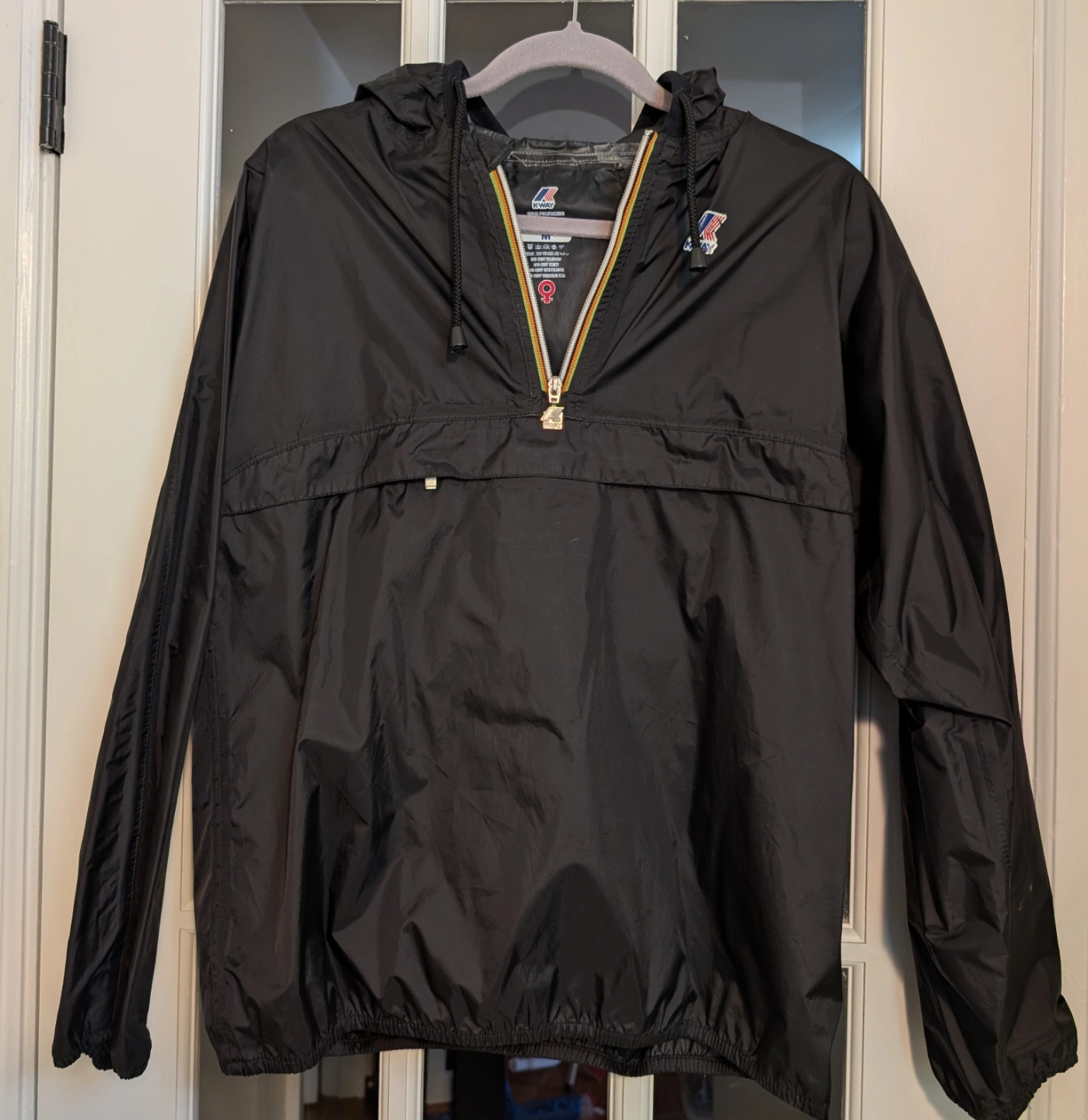 Black K-Way windbreaker. Size medium. Features a half zip closure, drawstring hood, and long sleeves. Some minor wear and tear - printed on labels have peeling as shown in photos. Packable, can be worn as a fanny pack. Last 2 photos are examples from website.