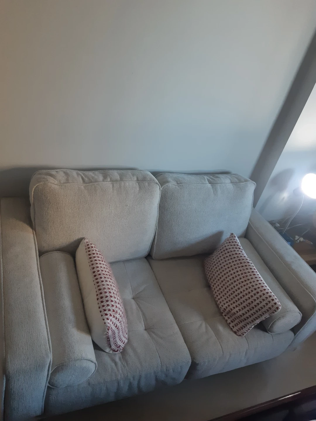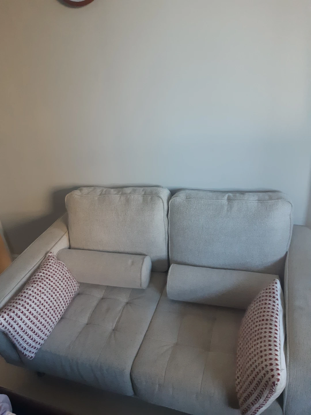 Two-seater sofa, light beige fabric. Includes two matching pillows. Button tufting detail. Simple, modern design. Great for small spaces.