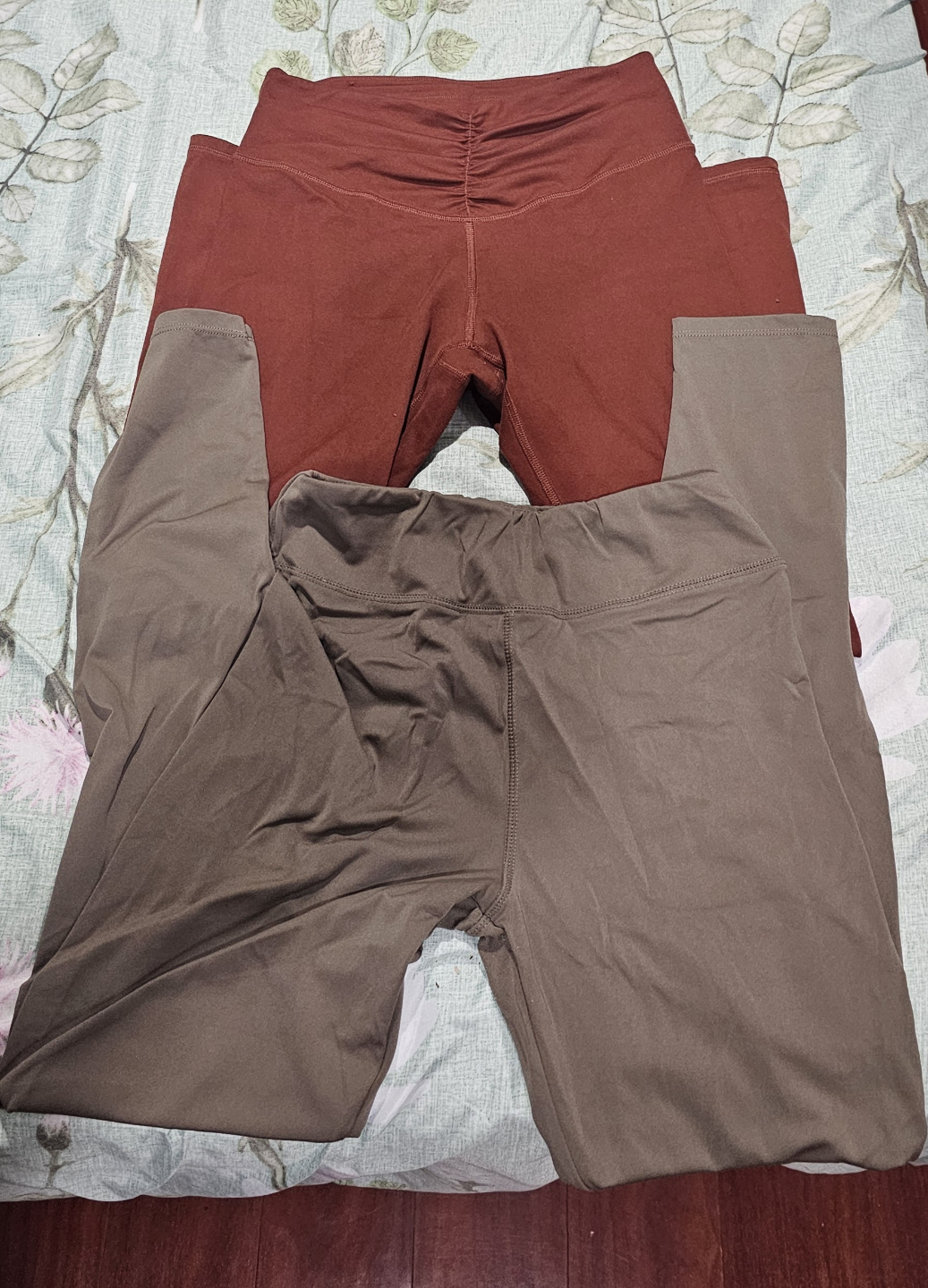 Two pairs of women's leggings. One burgundy and one taupe. High-waisted. Good condition.