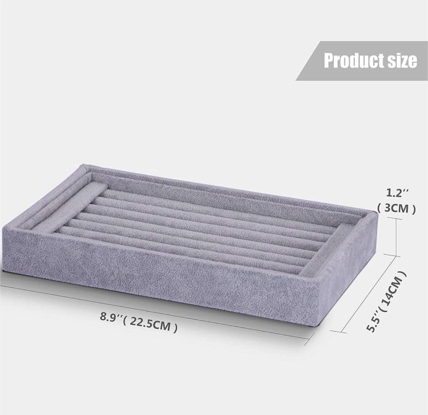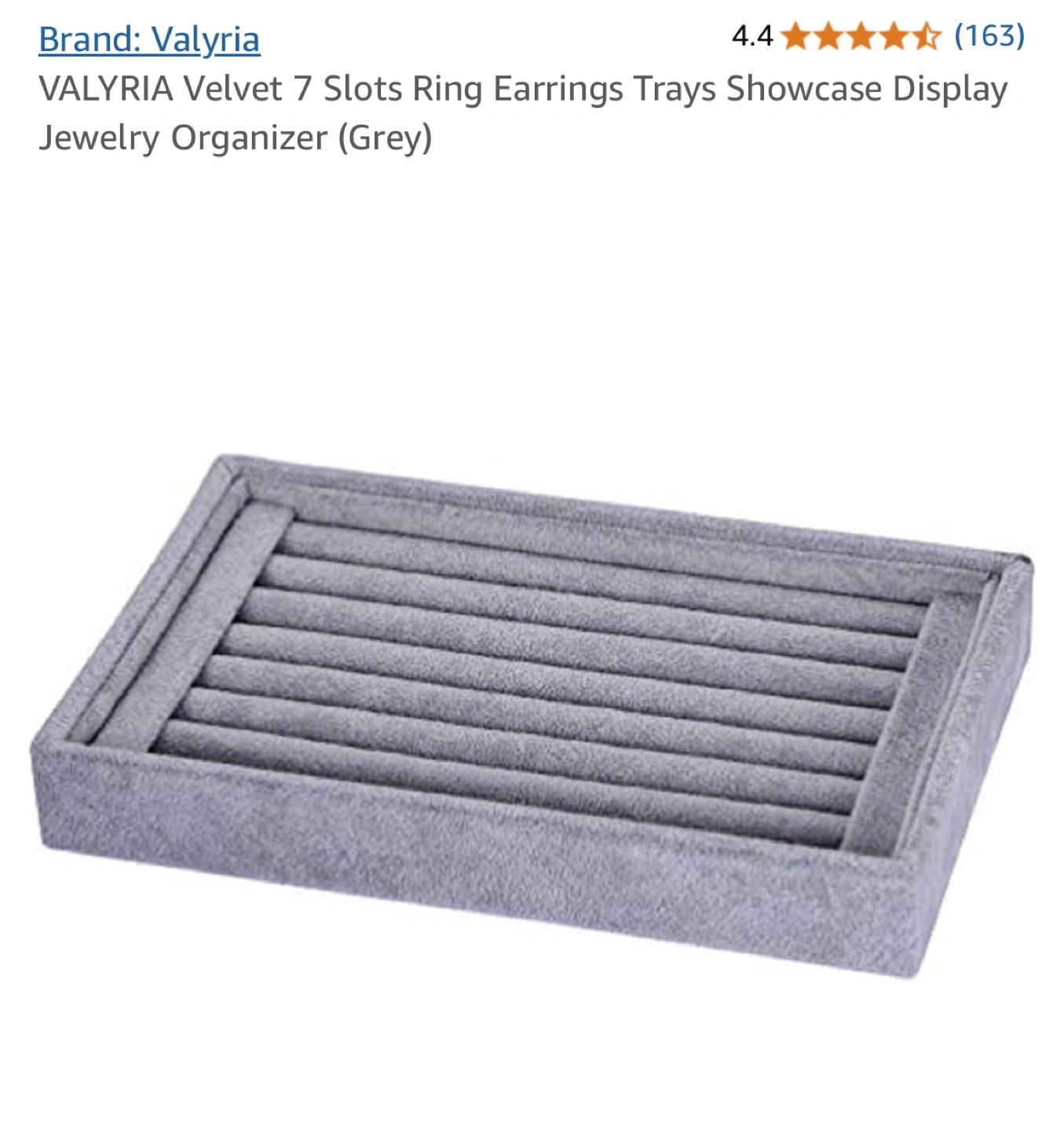 Seven slots for rings and earrings. Grey velvet. Compact and convenient for jewelry storage. Measures 8.9" x 5.5" x 1.2".