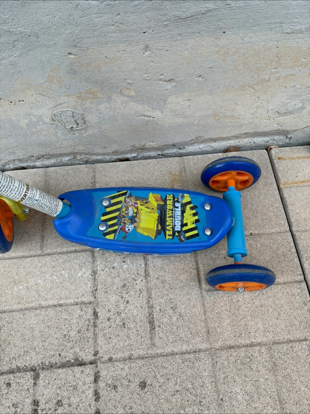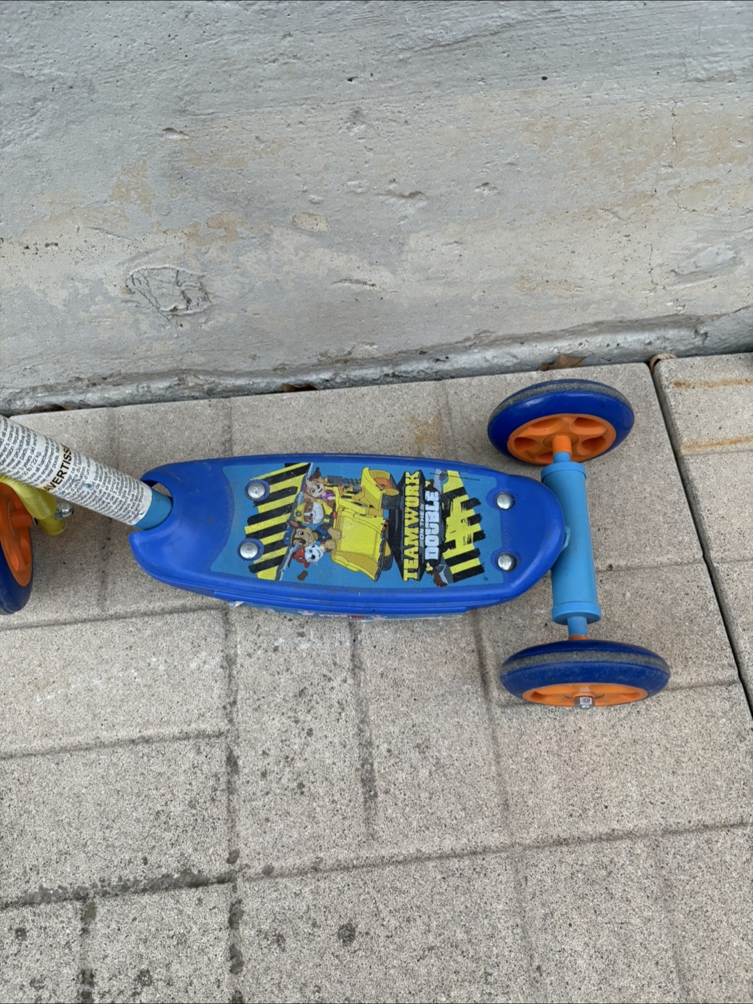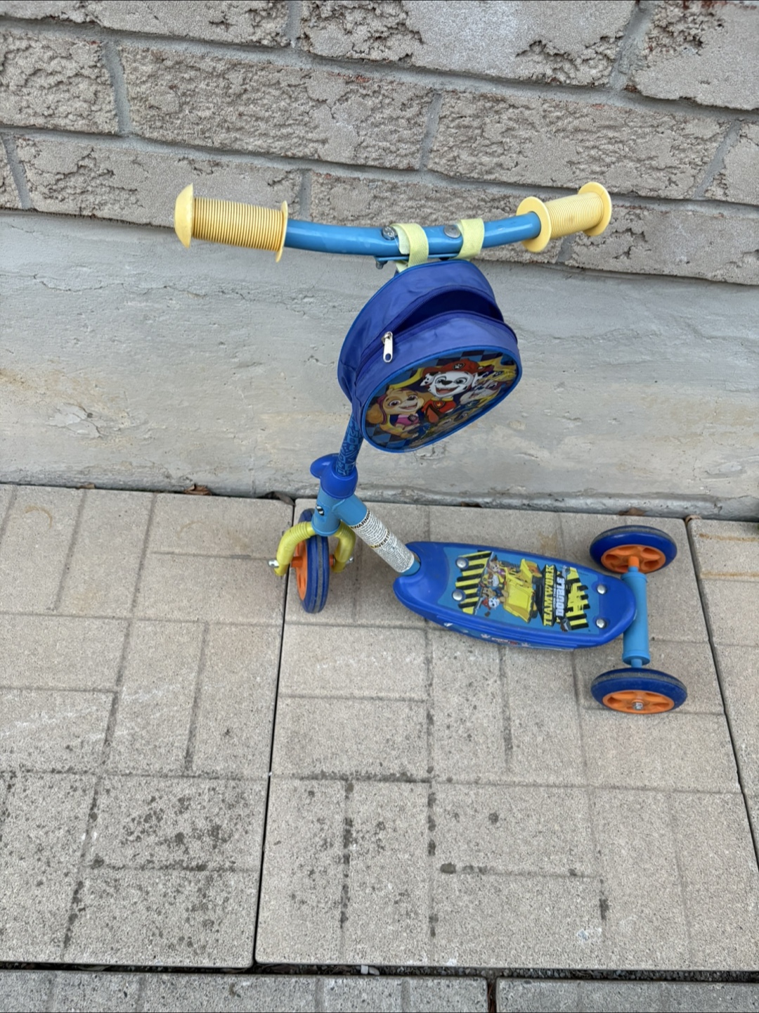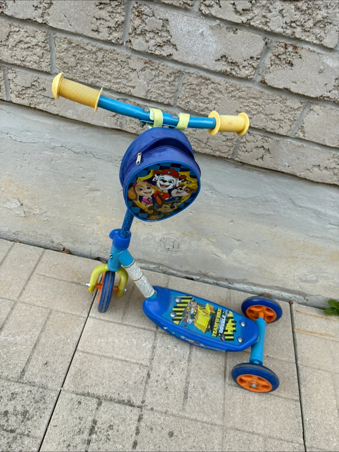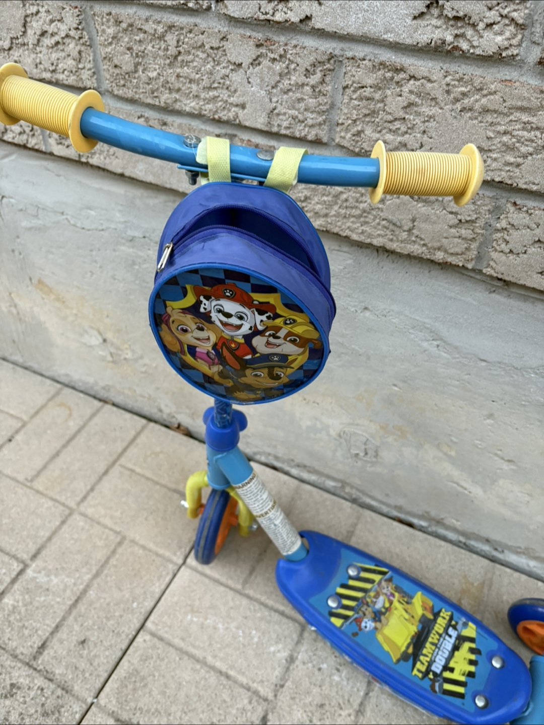 Three-wheeled scooter. Features Paw Patrol characters and a small attached bag. Blue and yellow colour scheme. Good for younger children.