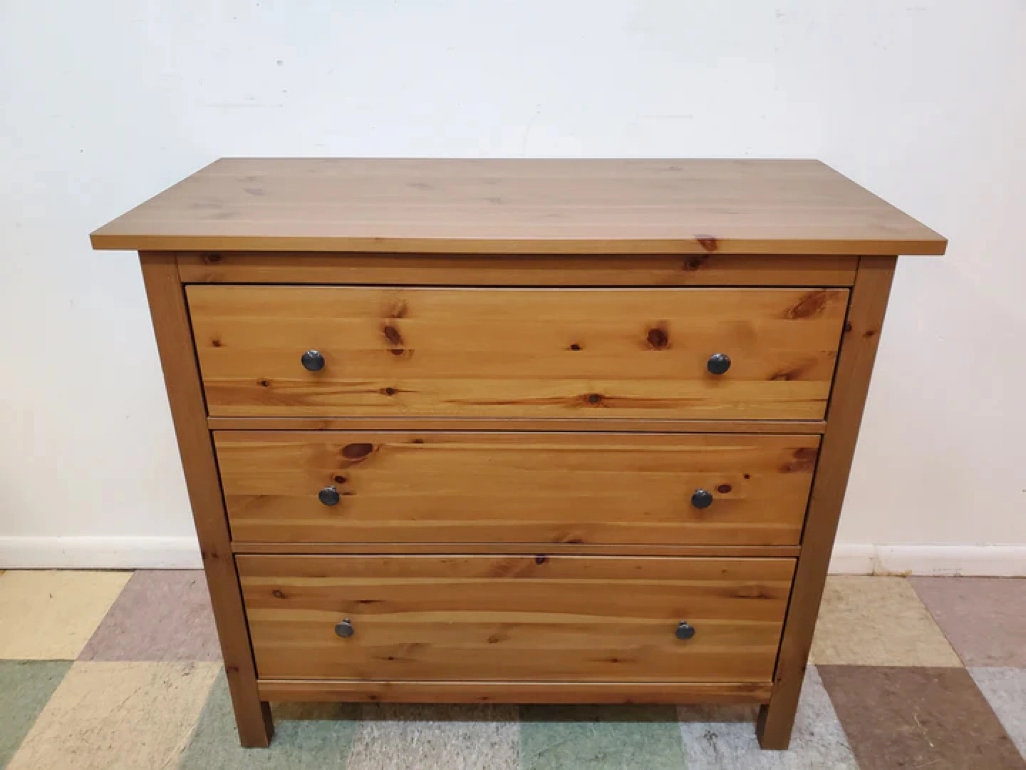 This is a used IKEA Hemnes 3-drawer dresser, perfect for adding storage to any room. It's in good condition and ready for a new home. This dresser features a classic design and ample space for clothes and other belongings.